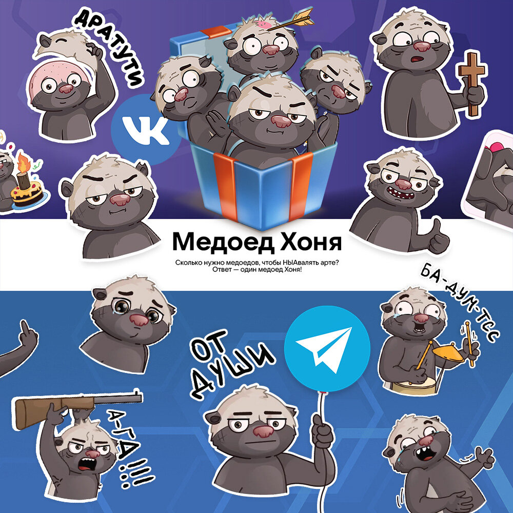 Стикеры Вконтакте Стикерпак с 48 уникальными стикерами, нарисованными эксклюзивно для ВК можно ПОЛУЧИТЬ ТУТ. Стикерпак распространяется в ВК на платной основе, стоит 10 голосов (~70 рублей). Хоть и основные цели добавления стикеров в ВК - это усиление узнаваемости персонажа (медоед Хоня) и возможность порадовать зрителей набором стикеров и Вконтакте, т.к. многим уже полюбились стикеры в Телеграм, о чем просят уже очень давно... Тем не менее! Незначительный % с продажи стикеров всё-таки поступает автору (Дарье) в качестве авторского гонорара. Иными словами - каждая покупка стикерпака - это не только коллекция из 48 уникальных стикеров с Хоней, но и небольшая плюшка Даше за её труды, ведь она старалась рисовала этот стикерпак почти полгода для нас всех. Спасибо пажалста :Е