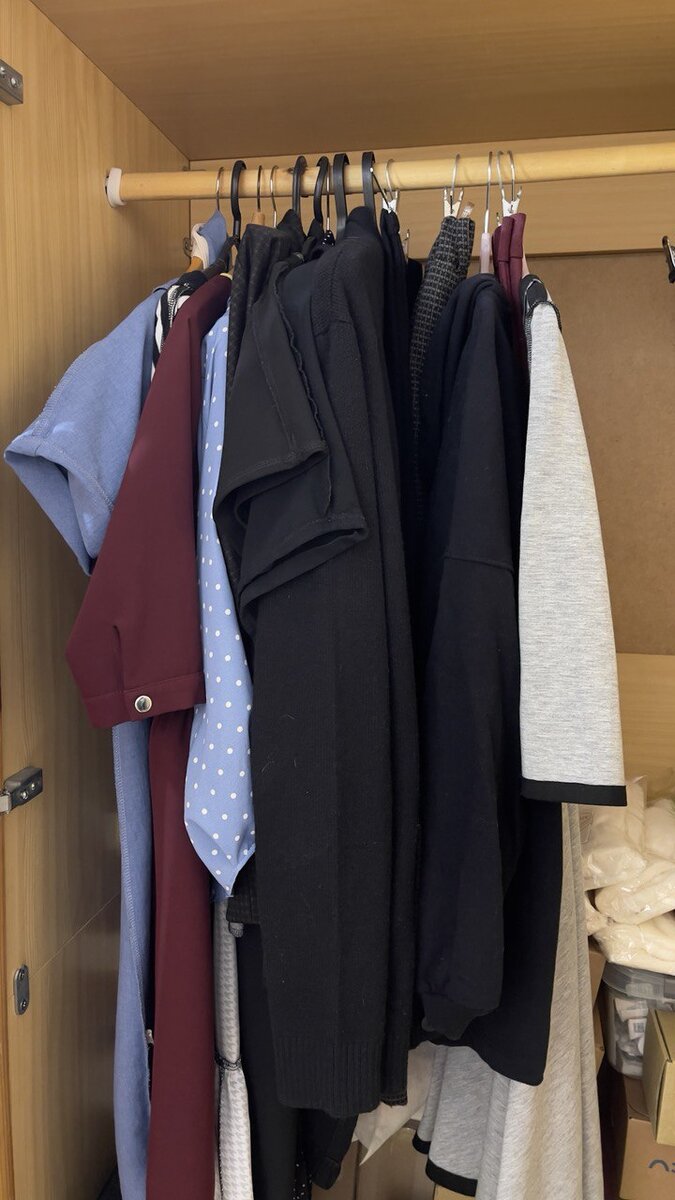 В итоге, из спальни вынесла одну большую коробку со всякими ненужными маленькими коробками из-под обуви, наушников, старых телефонов. Было много мелочи, по типу непишущих ручек, сломанной канцелярии. Помимо этого вынесла в мусорку 3 больших пакета с одеждой, которую уже стыдно пристраивать.