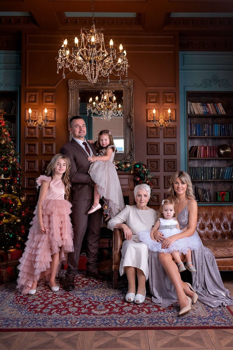 Рождественские праздники - особенное время, когда в воздухе витает атмосфера тепла, уюта и волшебства. Именно эту атмосферу запечатлевает семейная рождественская фотография. На снимке мы видим счастливую семью, собравшуюся в гостиной вокруг нарядной елки в предвкушении грядущего торжества. Родители обнимают друг друга, переглядываясь с улыбками. Рядом с ними стоят их дети - мальчик лет шести и девочка четырех лет. Младшая дочка прижимает к груди плюшевого мишку, старший сынок гордо держит в руках яркий подарок. В кадре запечатлена атмосфера теплых семейных отношений, любви и заботы. Это видно по тому, как родители обнимают друг друга, как старший брат заботливо положил руку на плечо сестренке. Ощущается трепетное предвкушение наступающего праздника, которое по-детски искренне отражается на лицах малышей. Такие фотографии хранят тепло семейного очага. Спустя годы они помогут вспомнить атмосферу уюта, любви и волшебства, окутывающую дом в рождественские дни. Этот снимок - как напоминание