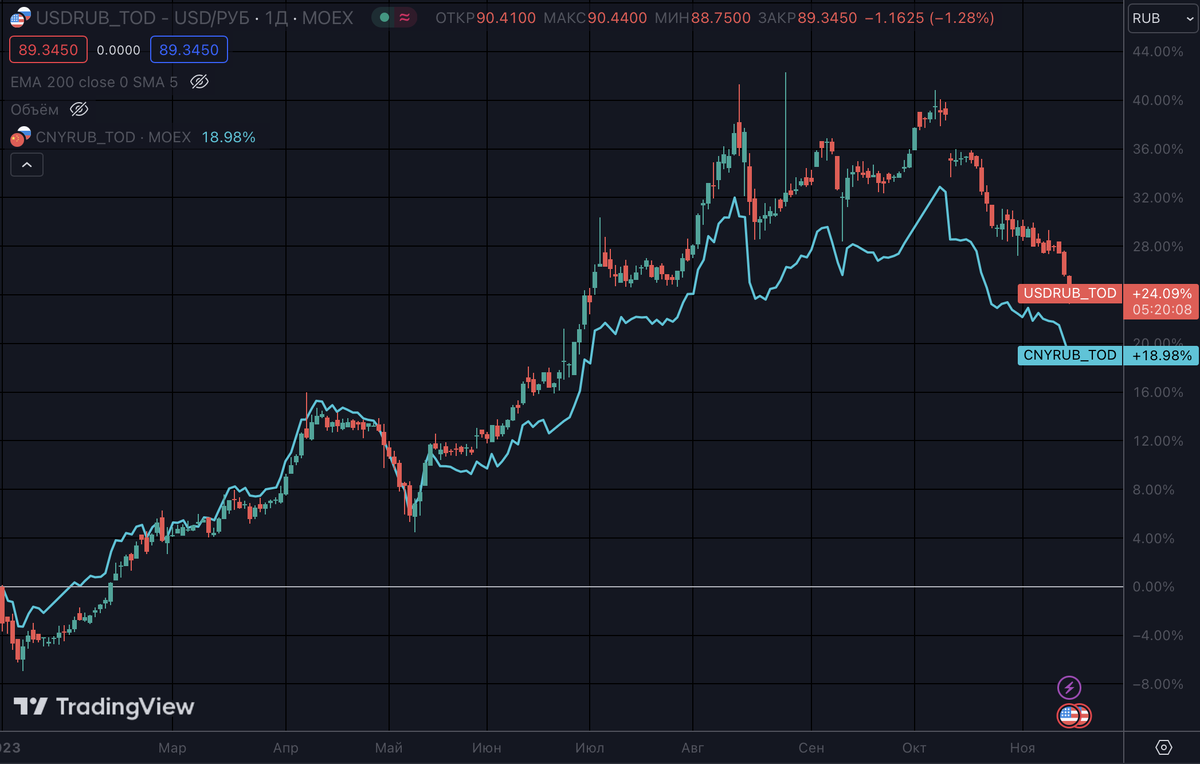 Сегодня я общался с представителями одного крупного федерального СМИ по вопросу вкладов в юанях. Мне регулярно прилетают похожие запросы, но. Знаете оно как бывает… Эти вопросы, темы - порой они диктуются банками или другими бенефициарами. Например, сегодня вышел мой комментарий в Известиях про рост микрозаймов и я прямо сказал о том, что плюсов в росте нет. Не все слова, но смысл примерный они донесли... Вот банкам сейчас интересно продать вклад в юанях, как свой продукт клиенту. А вот интересно ли это клиенту? Сейчас расскажу! Начнем с базы. Вот график: На нем изображен курс Доллар/Рубль (свечной график) и Юань/Рубль (голубой график). Как вы видите, рубль падал к доллару быстрее, чем к юаню. Почему так и сохранится ли тенденция - расскажу дальше, а теперь давайте посчитаем! Есть у нас Андрей и Борис. Андрей купил в начале года на 100 000 рублей доллары по 70 рублей. Получилось 1 428,5 долларов. Борис отнес 100 000 рублей в банк и открыл вклад в юанях. Купил юани по 10,47 рублей. По
