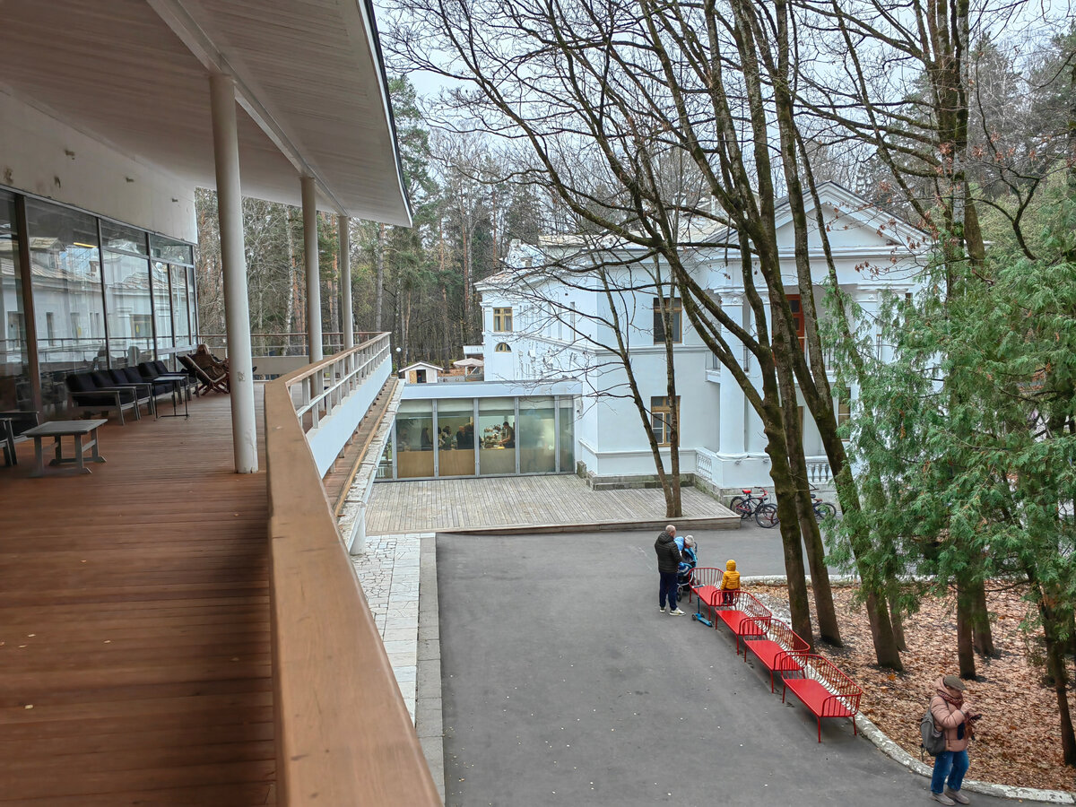 Теперь о хорошем. Попав сюда, ты переносишься во времени назад, в какое-то советское литературное прошлое. Сразу же влюбился в террасу на втором этаже с видом на домики, деревья, листву, небо. Хочется сесть в кресло, достать книжку, укутаться в плед попивая какао с солью... Тихо и очень умиротворяет. Пересказывать список писателей нет смысла, сюда точно стоит заехать. Очень много различных мероприятий, к примеру, застали переводческий фестиваль "Игры с огнем". В ресторан "Библиотека" столик нужно бронировать заранее.