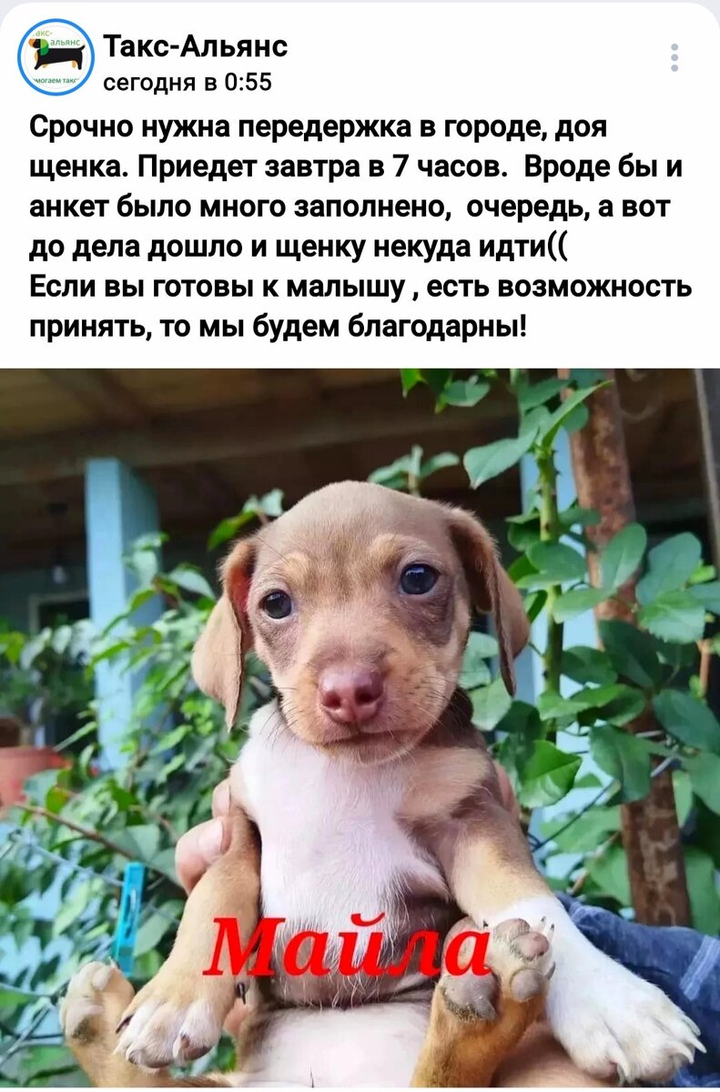 У Такс-Альянса есть замечательные, ответственные, терпеливые передержки. Их хозяева по-настоящему заинтересованы в помощи, по-взрослому взвешивают свои силы и помогли уже не одному беспризорному хвостику. Мы им бескрайне благодарны. Но собак становится все больше. Приходится искать новых желающих подарить четвероногому хоть временный дом. Чаще всего за это неблагодарное дело берутся люди, которые отдают себе отчет, что это серьезное дело, а не сиюминутное выпячивание собственного милосердия. Но бывает иначе. Особенно со щенками. Они ведь такие ути-пути на фотографиях. Лапулечки и масики. И вот, впечатленный милотой индивидуум, решает — беру! Буду добрым! Поселю маленькое чудо в своем доме и будет мне плюс к карме. И сообщает на стене ВК: «Возьму собачку!» Таксальянсовские волонтеры осторожно радуются. Осторожно, потому что восемьдесят, а то и девяносто процентов авторов таких откликов исчезают. Хорошо, если остается хоть один процент серьезно настроенных людей. Прекрасно, если есть вре