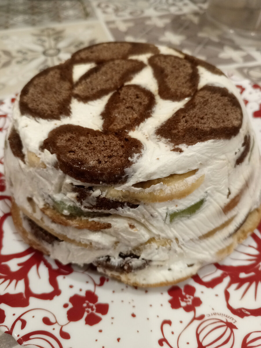 - Сверху пряники, сметана. И таким образом выкладываем слоями оставшиеся пряники, чередуя их со сметаной и начинкой ( чередуем бананы и киви). Затем отправляем торт в холодильник на 6-8 часов пропитаться.