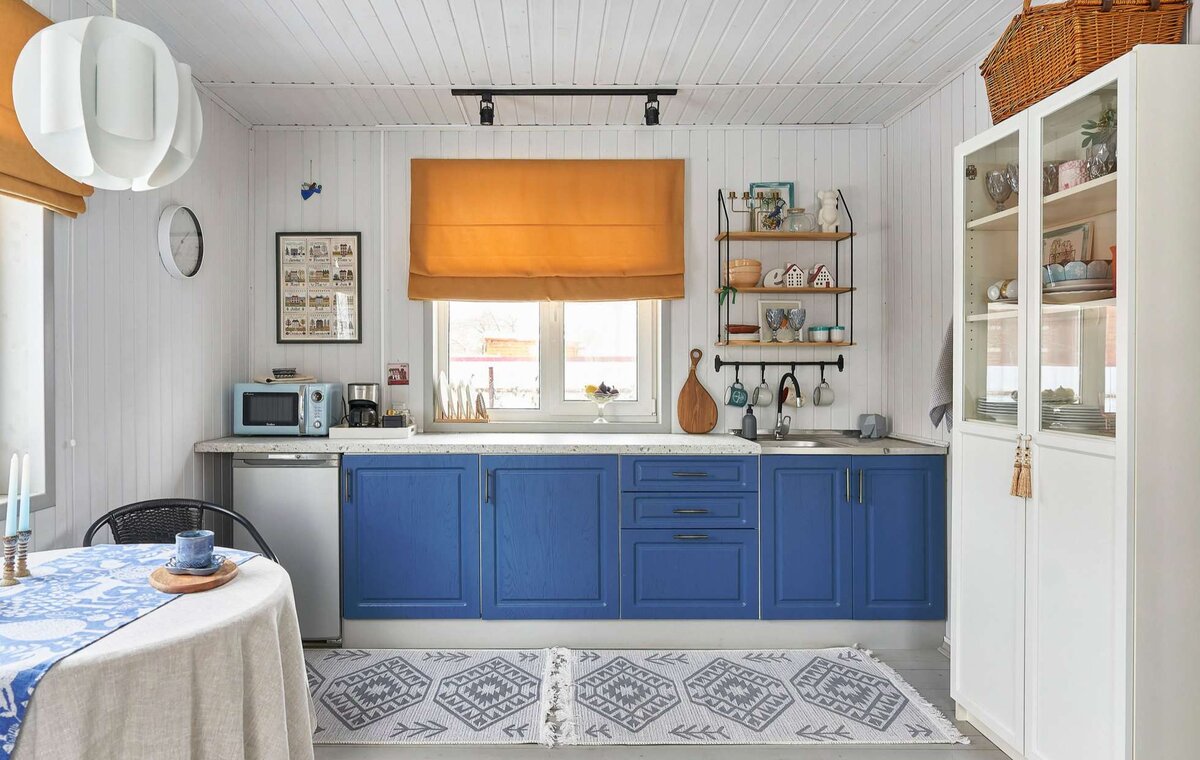 Кухня небольшая, нижние шкафы разместили вдоль узкой стены с окном. Сэкономить удалось практически на каждой позиции: каркасы шкафов и отдельно фасады с фабрики я заказала через посредника с «Авито», они обошлись в 15 500 руб., трехметровая неубиваемая столешница из ЛДСП из «Леруа Мерлен» — за 4000 руб., металлическую мойку и гибкий смеситель нашла в местном хозяйственном магазине. Холодильник тоже с «Авито», он идеально подошел по размеру. Мне хотелось, чтобы столешница была свободной, поэтому от встроенной варочной панели отказалась, вместо нее — переносная индукционная плитка на одну конфорку, вместе с микроволновой печью нам хватает.
