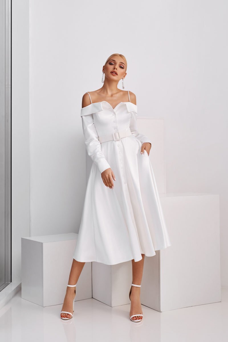 Свадебное платье длины миди с приталенным силуэтом и длинными рукавами. Модель с вырезом “лодочка” выполнена из белого атласа и застегивается спереди на ряд пуговиц сверху донизу. Талию подчеркивает ремень с пряжкой, а расклешенная юбка спускается немного ниже колен. СВАДЕБНОЕ ПЛАТЬЕ NOLLA MINORA Укороченное свадебное платье с приталенным силуэтом из атласа. Лиф с ровным вырезом декольте дополняют короткие пышные рукава-фонарики. Расклешенная юбка с бантовыми складками спускается от талии до щиколоток. Falcona Сдержанное свадебное платье прямого кроя с длинными рукавами. Лиф с полукруглой высокой проймой переходит в спинку с глубоким V-образным вырезом. Длинные пышные рукава на запястьях собраны узкими манжетами. Прямая юбка с симметричными бантовыми складками доходит до линии колен. Модель выполнена из фактурной ткани молочного оттенка.