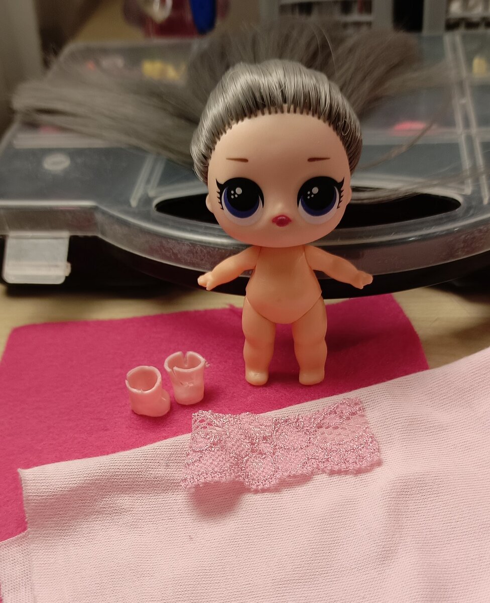 После переделки куколке-малышке нужна новая одежда. Размерчик конечно совсем маленький - шить не удобно. Поэтому одежка будет самая простенькая: трусики, рубашечка и сарафанчик. Из материалов понадобится полоска трикотажного кружева, тонкий трикотаж (кулирка) и мягкий фетр. Обувь оставлю ту, что была в комплекте с куклой.