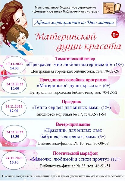 В преддверии самого светлого и доброго праздника в библиотеках города пройдут мероприятия, посвященные Дню матери.