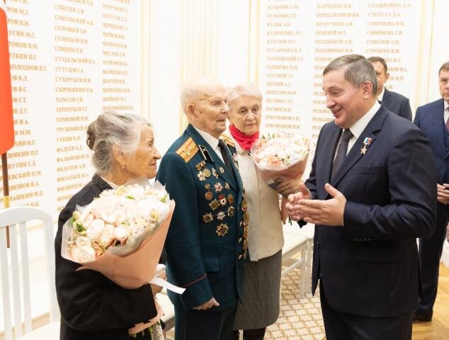 Сегодня губернатор Андрей Бочаров вручил знаки «Почётный гражданин Волгоградской области». Как уже сообщал РИАЦ, этого звания удостоены фронтовик Александр Иванович Колотушкин и житель осаждённого Сталинграда Тамара Васильевна Колбасина. Как сообщили РИАЦ в пресс-службе администрации области, в торжественной церемонии, прошедшей в зале Воинской и Трудовой Славы, приняли участие председатель облдумы Александр Блошкин, глава Волгограда Владимир Марченко, руководители общественных палат региона и города, представители заксобрания Санкт-Петербурга, участники СВО, юнармейцы. В своём приветственном слове Андрей Бочаров подчеркнул, что Александр Колотушкин и Тамара Колбасина представляют поколение Победителей, на чью долю выпали очень непростые, но по-настоящему судьбоносные события Великой истории нашего Отечества. Имена Александра Ивановича и Тамары Васильевны навсегда вошли в историю и золотыми буквами высечены на стенах Зала Воинской и Трудовой Славы Волгоградской области. «Вы и сегодня в