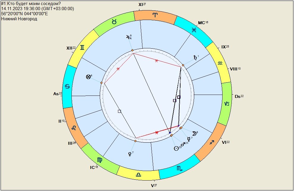 Иногда играю в «Вильяма Лилли», пробуя угадать пол и внешность того или иного человека, с кем мне предстоит встретиться. Так и в этот случай. Мы с семьей планировали отправиться в поездку на поезде. Мы купили три места в купе и за чашкой чая размышляли о том, кто будет нашим соседом по купе. Это изначально не радикальная карта, рассмотрение которой ни на что не влияет и является тренировкой по рассмотрению вопросов о поле будущего ребенка или внешности Квезита, с которым я не знаком – набор астрологического инструментария один и тот же. В данном случае я не рассматриваю радикальность, а сразу раздаю роли актерам. Герои: Кверент (я) – У1 Луна в Стрельце Квезит (попутчик, сосед) – У3 Солнце в Скорпионе Разбор (на астрологическом языке): Кверент (У1 Луна) в 5 доме – зона отдыха, удовольствия и развлечений. Луна Перегрин. Луна 1 градус назад отошла от Меркурия (У4) – уход от своей недвижимости. Квезит (У3 Солнце) в 5 доме – сосед у Луны будет, но сосед в другом знаке без аспектов и как б