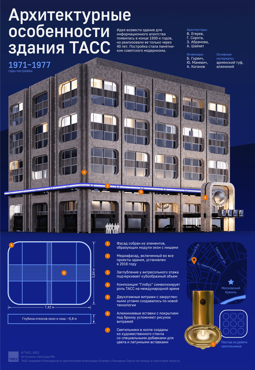 Подробнее об архитектурных особенностях памятника советского модернизма на Тверском бульваре — в инфографике ТАСС.