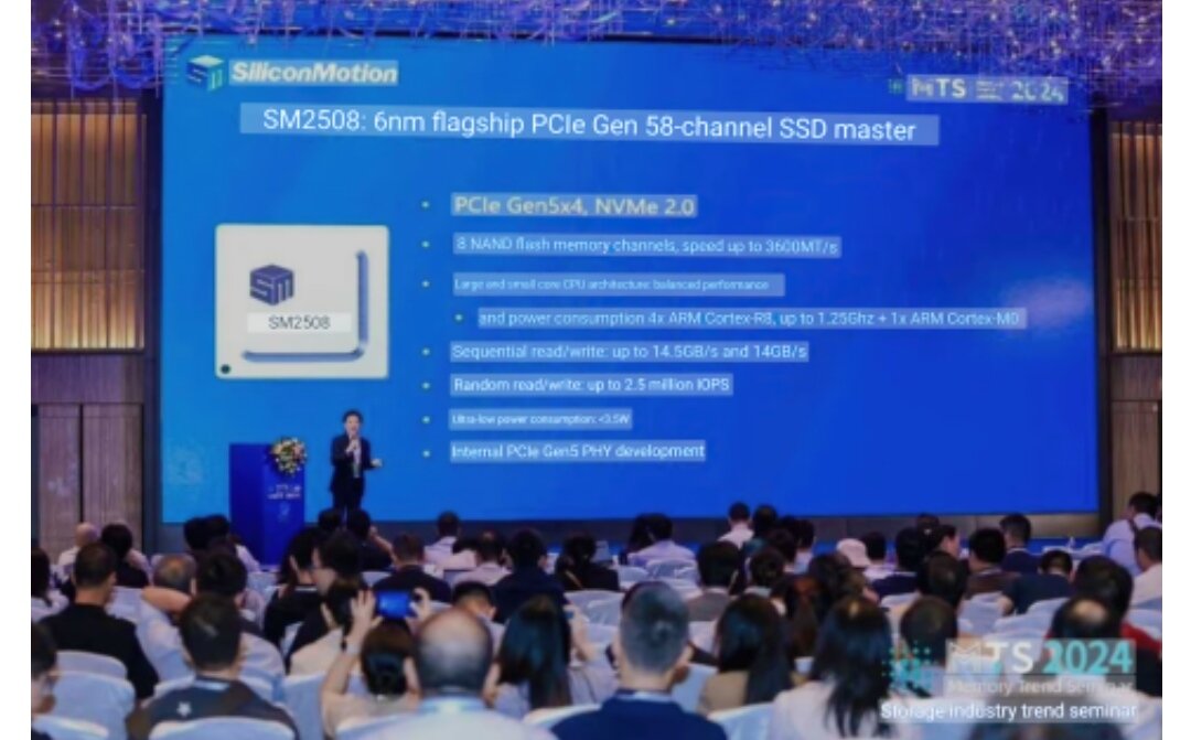 Silicon Motion внесла вклад в мир сверхбыстрых SSD, представив инновационный контроллер SM2508 с выдающимися характеристиками и низким уровнем тепловыделения. Этот продукт призван стать серьезным конкурентом для широко известной модели Phison E26, предлагая пользователю улучшенные возможности при существенном снижении тепловых нагрузок, что, в свою очередь, сократит требования к системам охлаждения. Контроллер Silicon Motion 2508, поддерживающий интерфейс PCIe Gen5, обеспечивает впечатляющие скорости чтения и записи до 14,5 и 14 ГБ/с соответственно (2,5 млн IOPS). Новинка совместима с ячейками памяти 3D TLC и QLC NAND, а также оборудована 8-канальными модулями DRAM, работающими на скорости 3600 MT/с (в сравнении с 2400 MT/с у Phison E26). Сердцем SM2508 является процессор с одним ядром Cortex-M0, а его изготовление по 6-нм техпроцессу TSMC позволило снизить энергопотребление на 45% по сравнению с 12-нанометровыми аналогами. Значительно меньший TDP – всего 3,5 Вт в сравнении с 5 Вт у мо