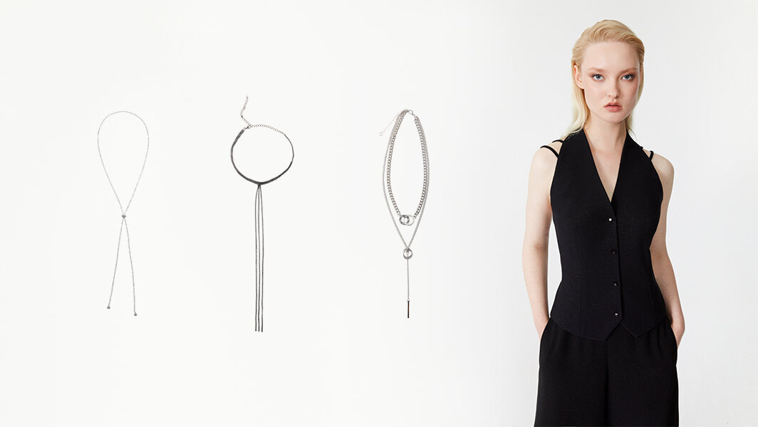 Несмотря на то, что воротник «под шею» сочетается не со всеми типами украшений, определиться с нужным будет всё же легко — просто отдавайте предпочтение любым длинным колье. Наиболее выигрышно будут смотреться цепи с крупными звеньями, акцентными элементами и кольцами. В этом случае украшение должно играть на контрасте и выделяться на фоне лаконичной водолазки, полностью покрывающей шею.