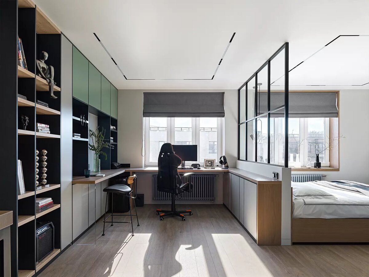 Домашний офис — это не просто место для работы. Здесь мы смотрим видео на YouTube, ищем идеи для вдохновения, учимся новому и просто расширяем кругозор. Компьютер стал центром Вселенной в интерьере. Раньше вся мебель вращалась вокруг телевизора, а сейчас есть смысл сделать более удобным и продуманным именно домашний офис. И дизайнеры RemPlanner расскажут вам как. Слишком маленький и неглубокий стол Самой популярной ошибкой в организации домашнего офиса по-прежнему остаются слишком маленькие столы (и по ширине, и по глубине). Как правило, речь идет о том столике, который вы попытались уместить в спальне. Лучше всего выбрать большую, но элегантную модель — без боковых полотен МДФ, на тонких ножках или каком-нибудь металлическом каркасе. Лаконичные, минималистичные, парящие модели хорошо впишутся в интерьер, несмотря на свой большой размер. Очень удобными на практике оказываются варианты с одной стойкой боковых ящиков. Проходная зона Расположение домашнего офиса в проходной зоне гостиной,