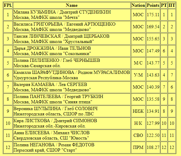 Поздравляю с победой Таисию Щербинину и Артема Петрова. Таисия только начинает погружаться в парное катание, пара образовалась буквально этим летом и вот уже первая серьезная победа. Результат впечатляет! Баллы для юниорского уровня вполне себе приличные (лучшие среди всех победителей нынешнего сезона). Обе программы спортсмены исполнили без грубых ошибок и падений.