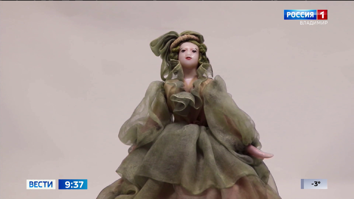 Это, так называемая, "кукла-половинка". И это не игрушка, а , скорее украшение. Она была частью шкатулок, пудрениц и конфетных наборов. А также ручками пуховок и щёточек, игольницами и даже грелками для чайников. Юбку делали " по моде" того времени и в зависимости от цели, которой такая кукла будет служить. Изготавливали их из фарфора, реже - из дерева и воска. Именно восковой экспонат - в коллекции Александровской слободы. Голова, верхняя половина туловища и нижняя половина рук у нее из воска. Куклы-половинки были популярны недолго: всего полвека, поэтому быстро стали коллекционной ценностью. Светлана Вершинина, специалист по связям с общественностью музея-заповедника "Александровская слобода": - Ценность нашей кукле придают отведенные в сторону руки. Самыми простыми считались куклы, у которых руки плотно прижаты к туловищу. И, надо сказать, что наша кукла, вероятнее всего, служила украшением городского интерьера или праздничного застолья в европейских традициях. ГТРК "Владимир"