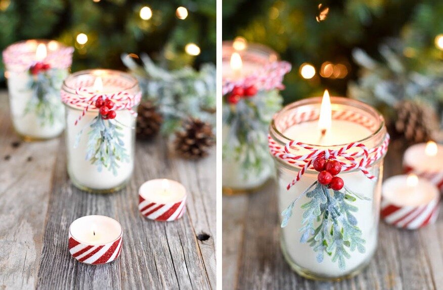 - Теперь осталось добавить украшения – обвязать банку джутовой веревкой, привязать ветку от елки и несколько небольших рождественских и зимних аксессуаров. Вот и все!
