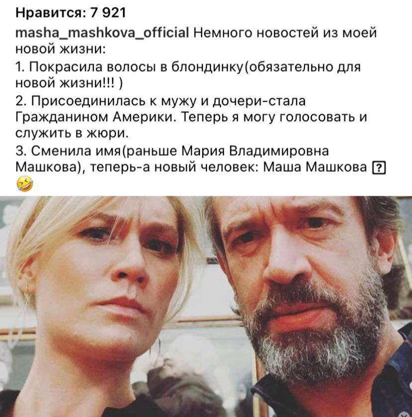 Теперь она предпочитает обозначаться именем Маша Машкова и является гражданкой Соединенных Штатов Америки. Окончательное принятие американского гражданства актрисой произошло в относительно недавнее время, вместе со своим супругом и детьми.