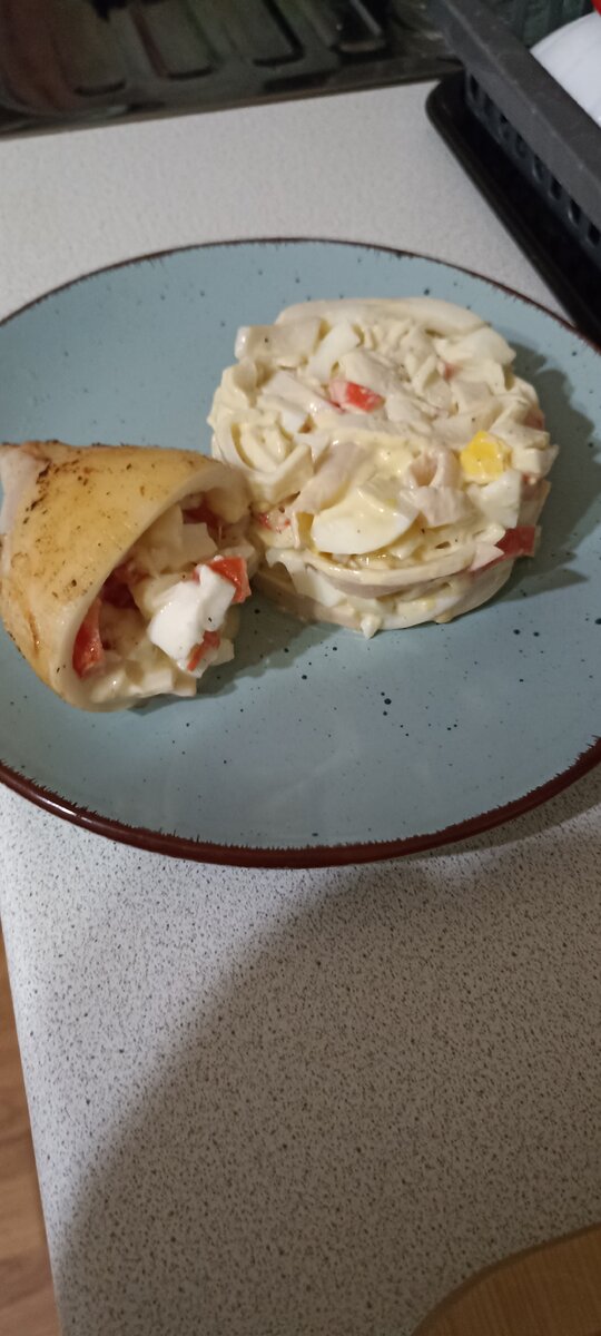 Вам понадобится: -кальмар 500г -яицо 4шт -крабовые палочки 100 г -майонез Отвариваем кальмар Также отвариваем яйца в крутую Нарезаем кальмар соломкой Крабовые палочки также нарезаем полосками Яйца нарезаем кубиком Все выкладываем в одну чашу Добавляем соль, пере и майонез по вкусу