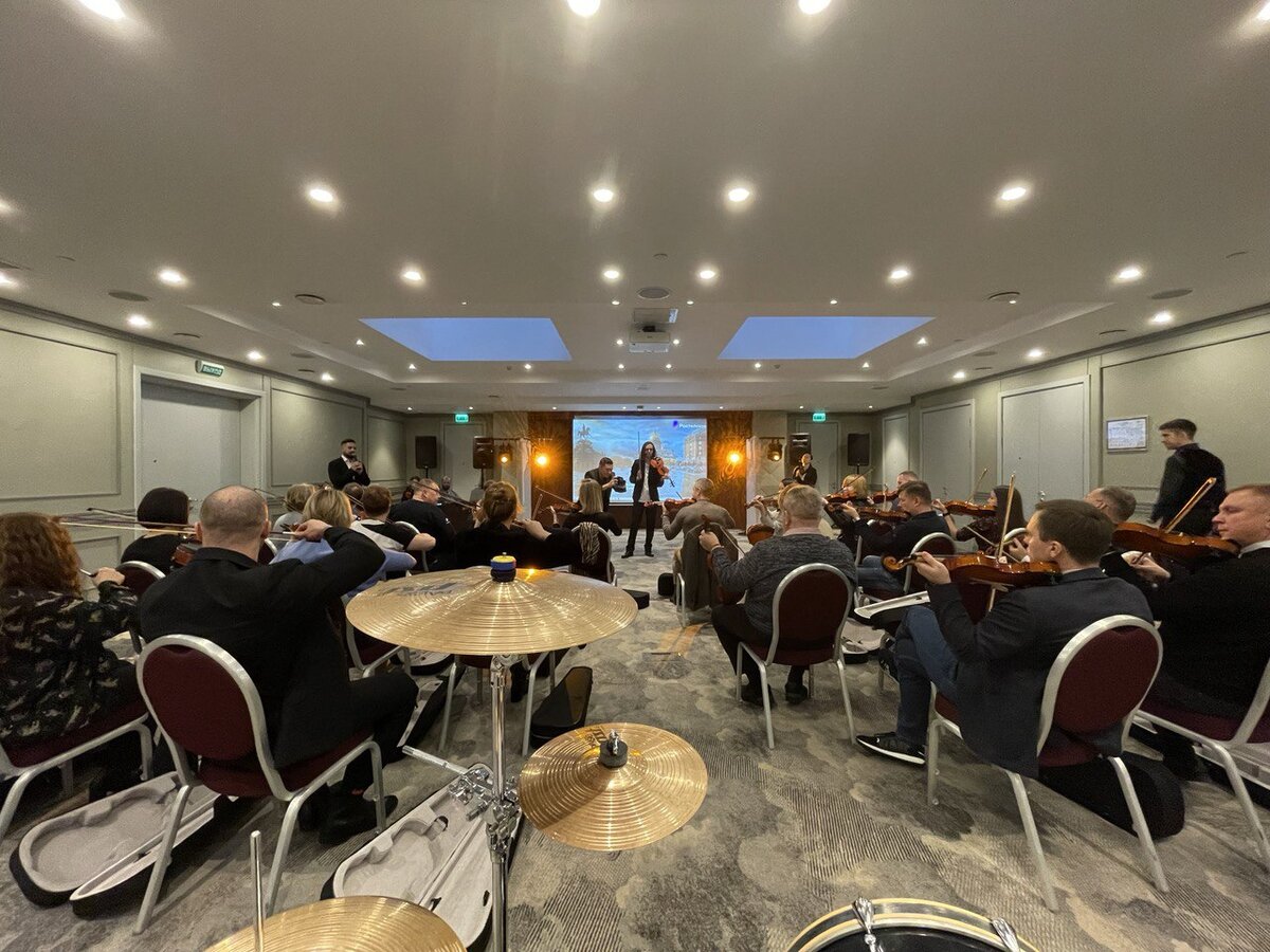 Давеча отыграл очередной ангажемент с проектом «Концертмейстер». Это одни из моих постоянных клиентов и занимаются они тем, что учат играть людей на скрипке – с нуля за два часа. Нет, вам не показалось: натурально, за два часа. Разумеется, речь не идет о самостоятельной и виртуозной игре, нет. Этот проект работает, как тимбилдинговая компания. Это значит, что эти ребята организуют досуг разным компаниям и предприятиям (в данном случае это был "Ростелеком") не в обычном смысле этого слова, а, скорее, наоборот. Представьте, что у вашей компании проходит корпоратив, и вам нужно его как-то оформить или разнообразить. Так вот проект «Концертмейстер» этим и занимается. Они привозят с собой 30 скрипок, свет и звук. Рассаживают 30 человек, дают им эти скрипки, и наш солист два часа рассказывает и показывает им, как извлекать звук из инструмента. Все это сопровождается моей игрой на барабанах, разбавляется общением с опытным конферансье, и по истечении двух часов эти люди, которые и не подозре