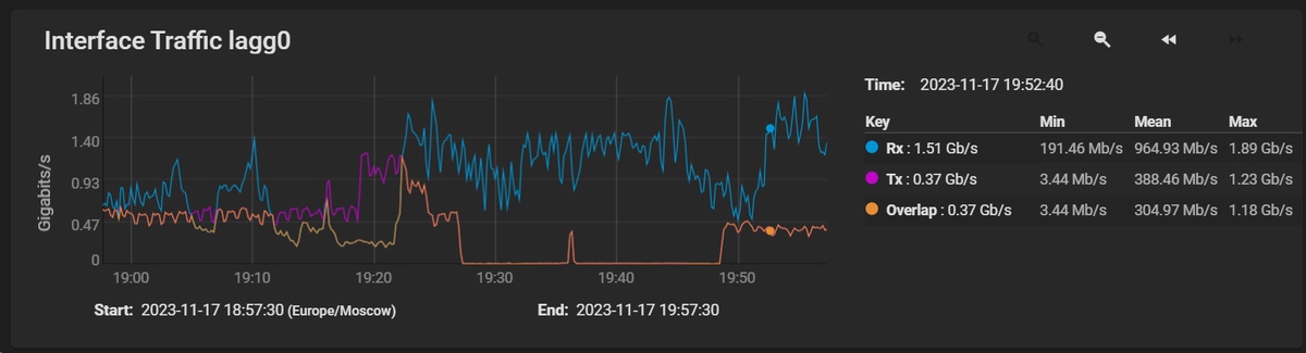 Сидел, смотрел на график утилизации сети на TrueNAS и пол часа не мог понять что он показывает. График отображает три показателя: С Rx и Tx всё понятно. Receive и Transmit: полученный и переданный сигнал, т.е. скорость получения и отправки. Если углубиться в тему, то раньше было RD и TD, что подразумевало Receive Data и Transmit Data. Потом писать стали RxD и TxD, где x — просто крестик. Это было сделано для того, чтобы не путать в документах и описаниях интерфейсов сокращения RD (Read) и RxD (Receive Data). Потом А упало, Б пропало... вернее третью букву было писать лень и получилось Rx и Tx. Ладно, не просто так оно потерялось, потому как принимать и получать можно не только данные, а, к примеру, сигнал. Так Rx и Tx могут означать уровень мощности принимаемого и передаваемого сигнала. Не в нашем случае, конечно. Ещё бытует мнение, что x символизирует какую-то неведомую Хреновину, но это уже мистика. А что, блин, такое Overlap?! Потом дошло, это минимальное значение среди Rx и Tx. Ove