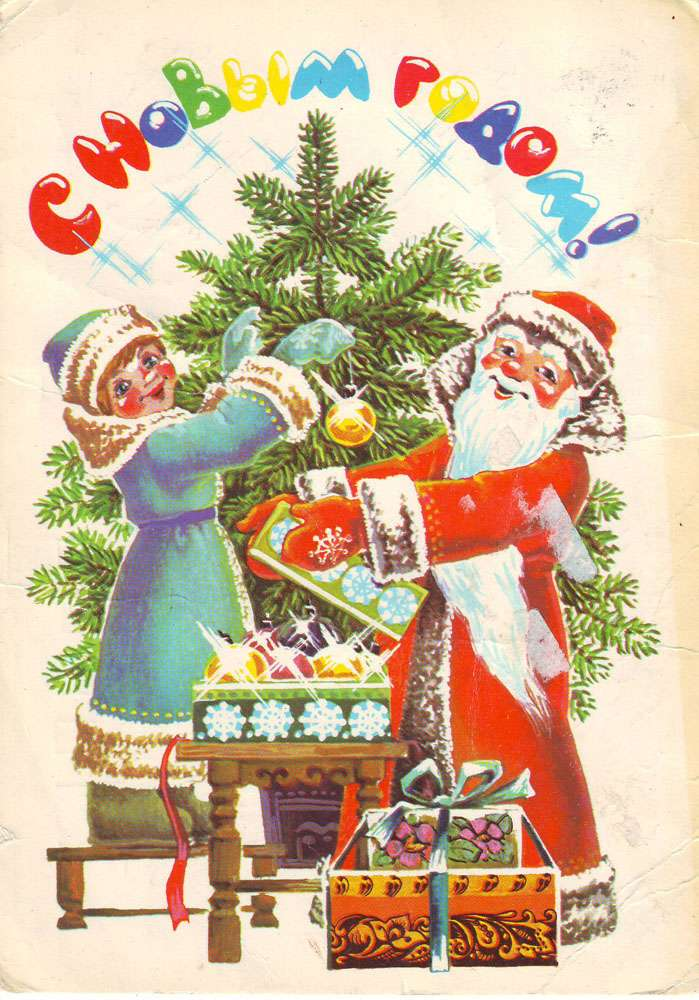 Когда речь заходит о новогодних игрушках, люди с удовольствием начинают обсуждать эту тему, вспоминать, что именно украшало их ёлки в детстве и что есть сейчас. Целые наборы для украшения елочки становятся редкостью, ведь, согласитесь, не так легко сохранить через годы пять - семь- двенадцать стеклянных игрушек. Но, скорее всего, у каждого имеются дома разноцветные ёлочные шары и украшения, подобные им. Вот и на новогодних открытках не обходится без шаров. Дед Мороз, Снегурочка и мальчик - годовик украшают ими нарядные ёлочки. А главный волшебник года еще и успевает подписать последние письма года, зная, что его ёлка уже наряжена. И куда без бенгальских огней, которые напоминают искрящиеся шары. Открытки с ёлочными шарами обладают интересным свойством - в детстве они кажутся обычными, а вот потом разглядывать их - сплошное удовольствие. Обращаешь внимание и на огоньки за окном, и на знакомые игрушки, и даже на цвет серпантина :). Кроме шаров на ёлочке интересно смотрятся фонарики и пр