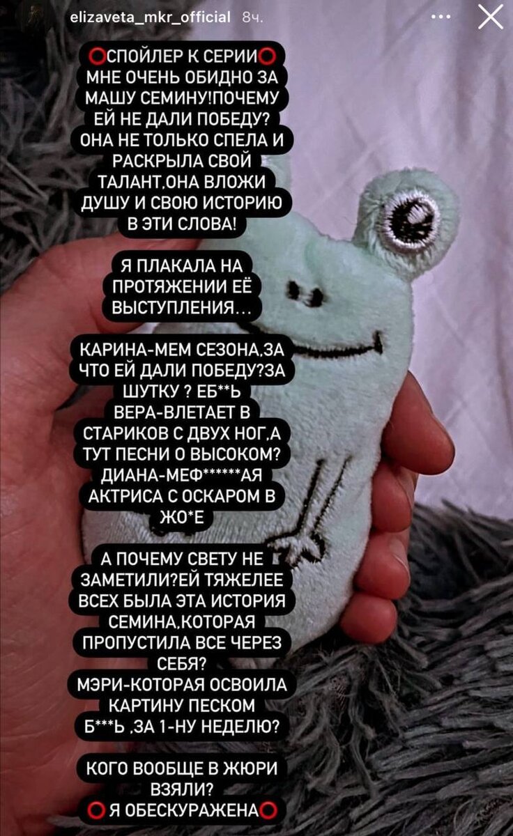 «Карина мем сезона, за что ей дали победу? Вера влетает в стариков с двух ног, а тут песни о высоком? Диана м*федр*новая актриса с оскаром в жопе» Так же девушка сказала, что ей была обидно за Машу Сёмину
