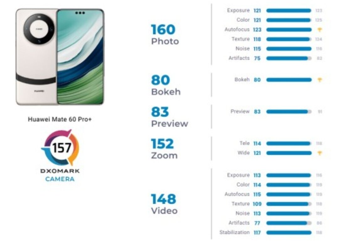 Самый свежий представитель HUAWEI, смартфон Mate 60 Pro+, после интенсивного тестирования в DxOMark, уверенно взял вершину рейтинга, став лидером в мире камерофонов. Эксперты выявили три новых рекорда в различных категориях, подчеркнув важнейшие особенности устройства в своем подробном отчете. Тройной арсенал задней камеры HUAWEI Mate 60 Pro+ представлен следующим образом: - Основная камера: 48 Мп, ЭФР 24 мм, f/1.4-4.0, OIS - Ультраширокоугольная камера: 40 Мп, ЭФР 13 мм, f/2.2 - Телеобъектив: 48 Мп, ЭФР 90 мм, f/3.0, OIS Эксперты выделили впечатляющее качество фотографий в широком диапазоне фокусных расстояний от 13 до 150 мм (цифровой зум). Среди ключевых достоинств устройства — мастерство в балансировке между детализацией и шумоподавлением, точная экспозиция, широкий динамический диапазон и естественная передача цветов. Эксперты DxOMark также высоко оценили работу диафрагмы с переменным значением: от f/4.0 для четкой фокусировки до f/1.4 для создания естественного эффекта размытия,
