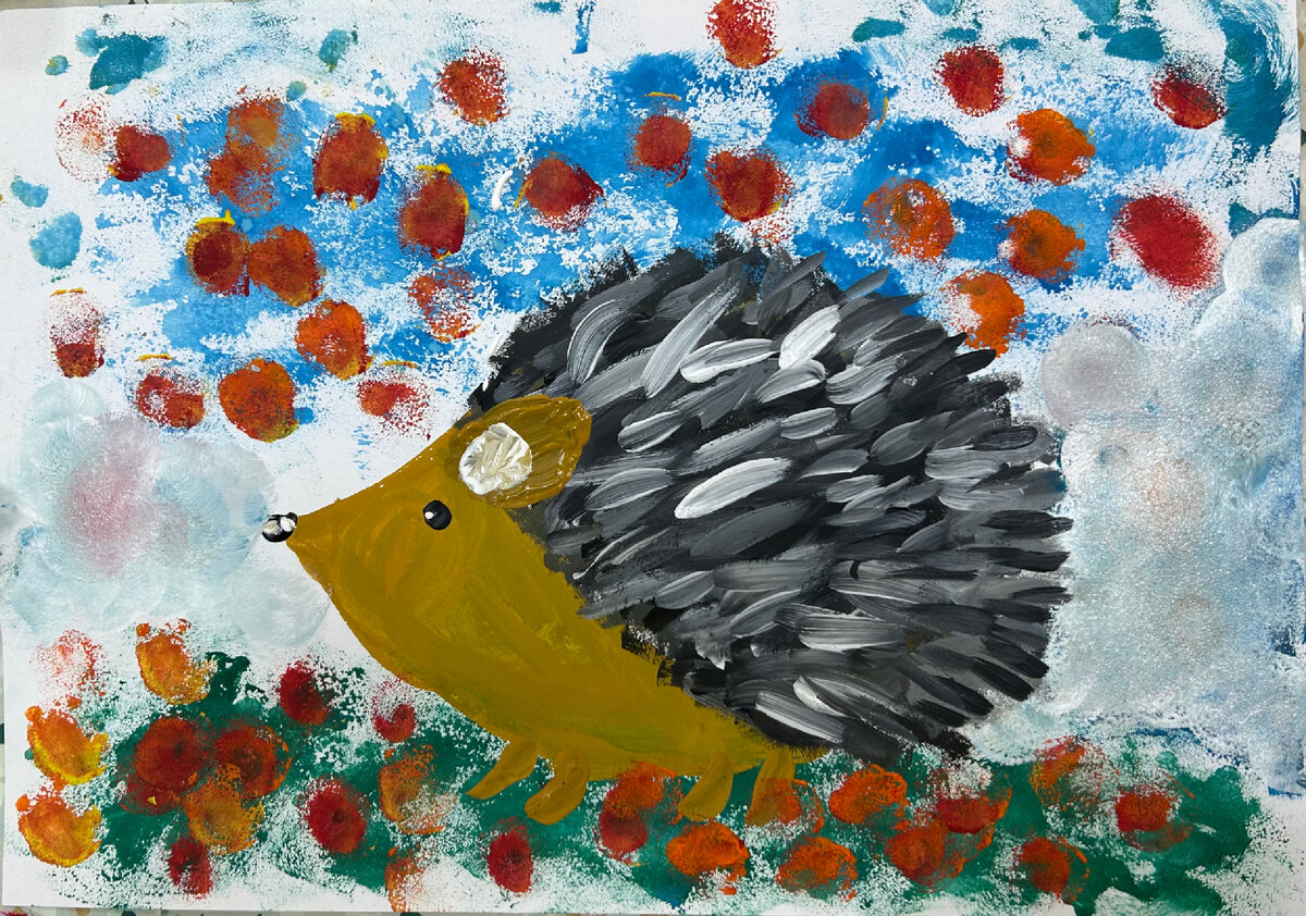 Листья дети рисовали губками - штампами, опустив их в смешанную краску: желто-оранжевый , желто-красный. Под ногами ежика тоже прорисовали листики и травку.