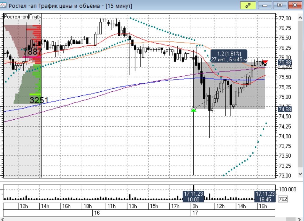 Торговлю в пятницу открываем ловлей шпильки по цене префов Ростелекома. Через почти семь часов закрываем сделку с прибылью 1,6%.