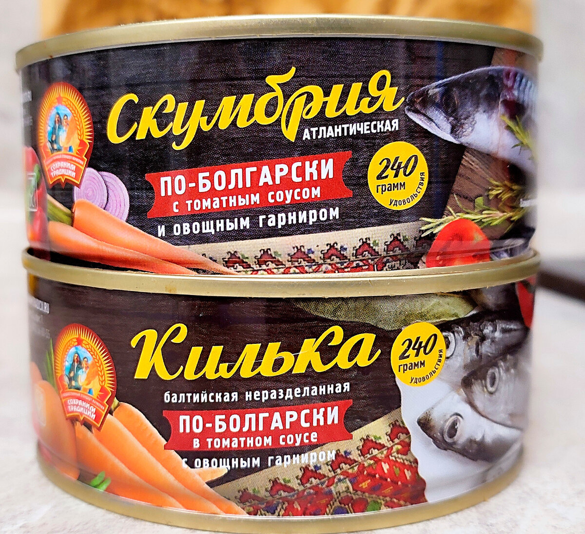 Всём привет! Сегодня под картошечку пробую новые консервы. Килька и скумбрия по-болгарски. Такие варианты кильки с овощами я уже пробовал, в Светофоре были похожие консервы. А вот скумбрию в томатном соусе никогда не пробовал. Килька 59,90 р. Скумбрия 84,90 р. Начнем с кильки. Интересно само качество и оформление банок. Вся информация и картинки напечатаны на самой банке. Без каких-либо бумажных этикеток. Наверно дорогое удовольствие. Изготовитель: ООО "Сохраним традиции", г. Калининград. Состав: рыба, томатный соус (паста томатная, сахар, масло подсолнечное рафинированное дезодорированное, соль, мука пшеничная, лук, регулятор кислотности-уксусная кислота ледяная(Е260), перец душистый, перец чёрный, экстракт пряностей (перец душистый, перец черный, гвоздика, кориандр, лавровый лист), гарнир (лук, морковь). Соус по-болгарски, а болгарского перца нету(. А так получается обычный состав кильки в томате с добавлением моркови и лука. Изготовлено как обычно из мороженного сырья. Сро