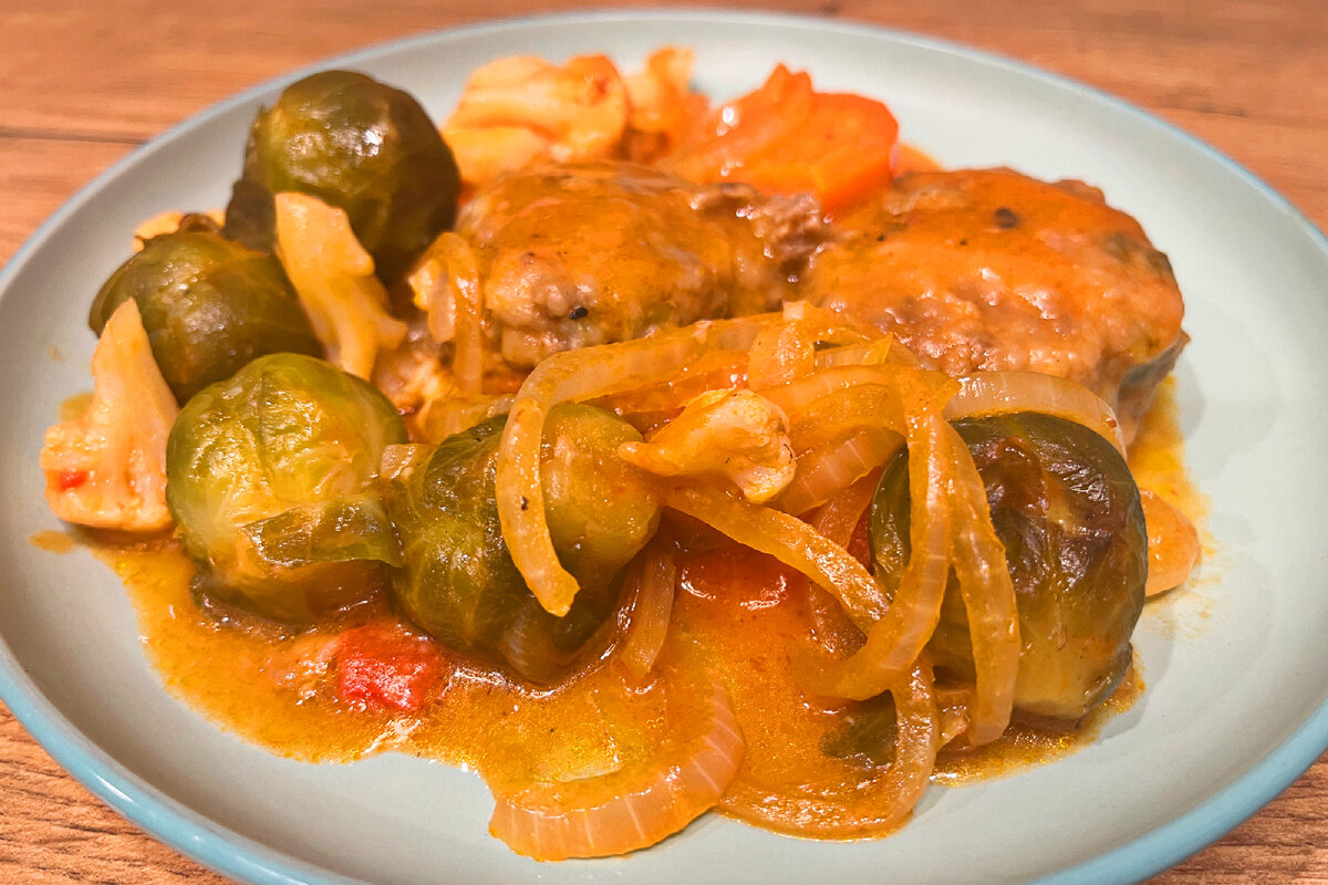 ТЕФТЕЛИ В ТОМАТНОМ СОУСЕ С БРЮССЕЛЬСКОЙ И ЦВЕТНОЙ КАПУСТОЙ
