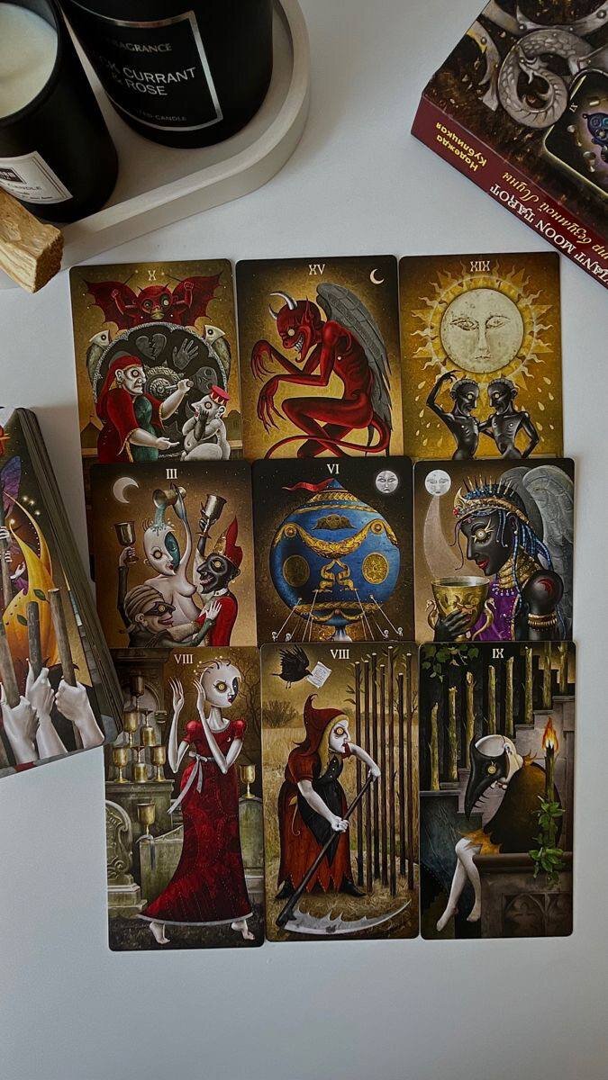 Таро Безумной Луны (Deviant Moon Tarot) заслужило славу одной из самых причудливых и пугающих колод Таро. Иллюстрации будто созданы человеком, только что пробудившимся от кошмара, карты населены странными луноликими персонажами, разнообразными чудовищами и духами, и почти на каждой картинке на желтовато-коричневом зловещем небе сияет луна или месяц. Считается, что Таро Безумной Луны — колода не для новичков, однако, если странные работы художника вызывают у вас не только мурашки ужаса, но и воодушевление, желание разгадать тайны этого действительно сильного Таро, вы преуспеете в работе с этой колодой, даже если это ваши первые карты. КТО Я ТАКАЯ? Или зачем вам тратить 5 минут жизни на прочтение моей статьи? Меня зовут Людмила Соболева, я практикующий таролог и нумеролог, со стажем более 5 лет, эксперт по матрице судьбы, провожу обучение картам таро, выпустила 2 потока мастеров таро. ✅ Помогаю ученикам быстро и интуитивно читать расклады ✅ Провела более 6000 личных консультаций ✅ Об