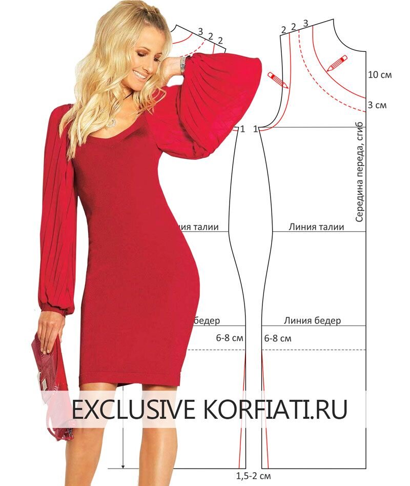Изюминкой представленной модели платья являются рукава с плиссировкой. Выкройка трикотажного платья моделируется по Выкройке платья без вытачек. Рукав — по Выкройке одношовного рукава