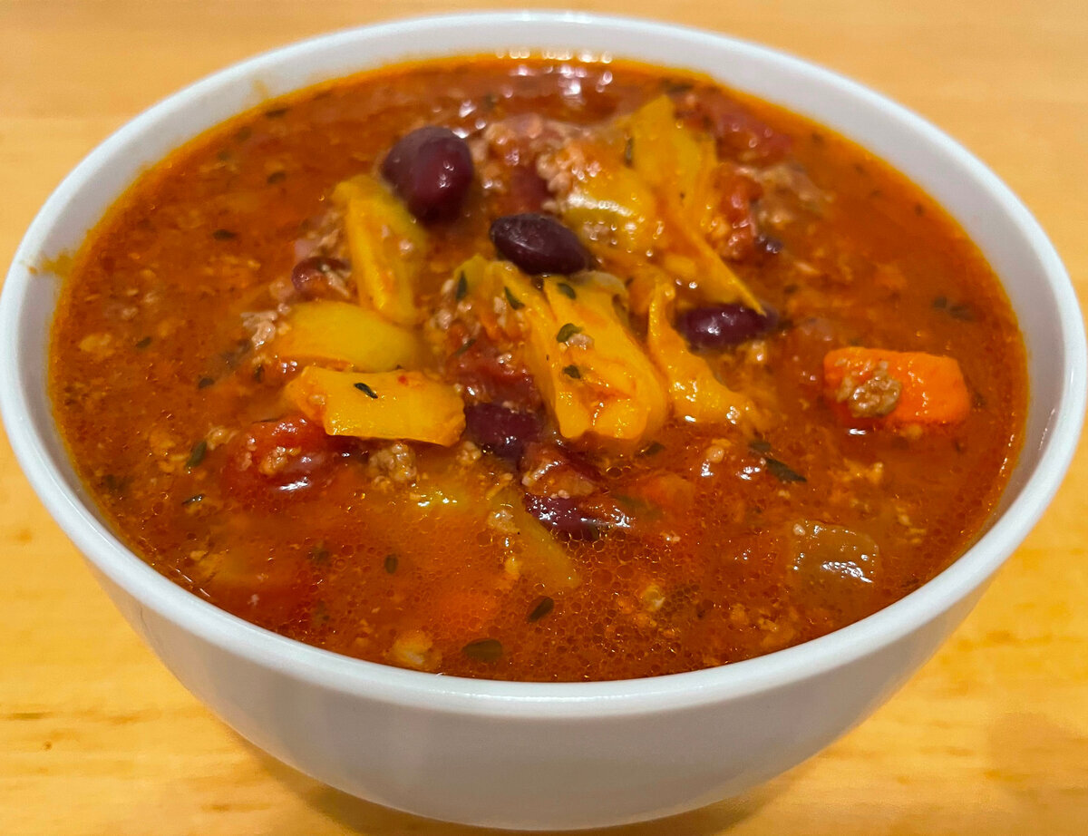 2 головки репчатого лука 2 зубчика чеснока 50 г копченой свиной грудинки или бекона 2 моркови 2 крупных сладких перца любого цвета 400-500 г говяжьего фарша 1 банка очищенных помидоров в собственном соку или порезанных кусочками помидоров в собственном соку (вес нетто: 800 г) 1 банка красной фасоли (масса основного продукта: 250 г) соль, молотый черный перец молотый острый красный перец 1 ч.л. молотого сушеного тимьяна или 1 ч.л. молотого сушеного орегано 1. Лук и чеснок почистить, нарезать мелкими кубиками. Копченую грудинку или бекон нарезать небольшими кусочками. Морковь очистить, помыть, обсушить, нарезать мелкими кубиками. Стручки сладкого перца помыть, обсушить, разрезать на четвертинки, удалить плодоножки, зерна и белые перегородки, нарезать полосками. 2. Растительное масло разогреть в кастрюле. Слегка обжарить на нем, а затем потушить до прозрачного оттенка на среднем огне кусочки лука, чеснока и копченой грудинки или бекона. Добавить фарш и и обжаривать, помешивая, прибли