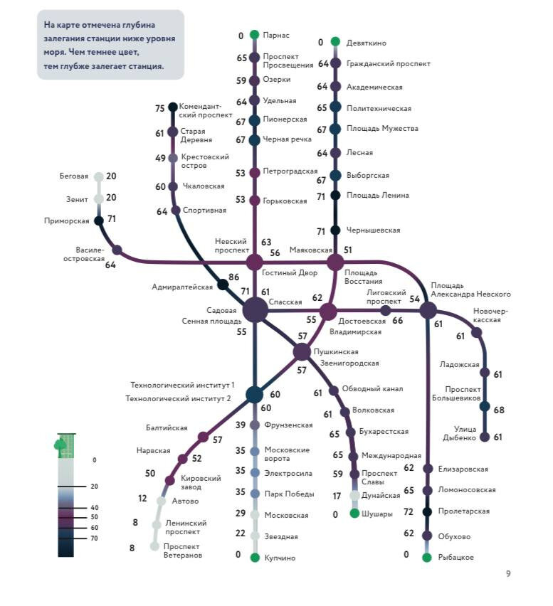 Глубоко копает. В Петербурге наглядно показали, какие станции метро заложены ниже остальных «Метрострой Северной столицы» собрал в одну инфографику данные о глубине петербургского метро. Первое место вы знаете, второе кого-то может удивить. Глубину залегания станций МССС нанес на схему метрополитена. Не секрет, что ниже всех построен зал «Адмиралтейской» — 86 метров. Некоторые считают, что второе место у «Площади Ленина», но все совсем не так. Серебро — у молодой станции «Комендантский проспект» с 75 метрами. Далее идет «Пролетарская» (72 метра), и лишь потом наступает очередь целой группы станций по 71 метру, в которой кроме «Площади Ленина» «Чернышевская», «Приморская» и «Садовая». Список самых «мелких» более очевиден: это «нулевые» «Купчино», «Парнас», «Девяткино», «Шушары» и «Рыбацкое». Далее идут безэскалаторные «Проспект Ветеранов», «Ленинский проспект» и «Автово», а затем станции последнего призыва — «Дунайская», «Беговая» и «Зенит».В глубину залегания традиционно упирается срав