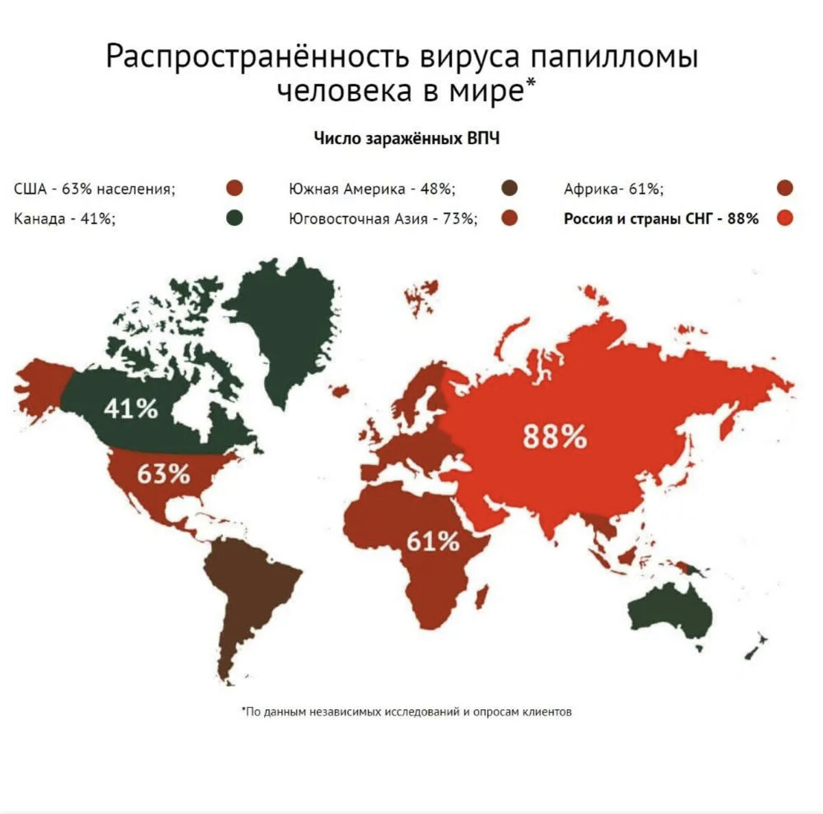 Около 85 - 90% мужчин и женщин инфицируется ВПЧ в течение всей жизни. 660 млн человек в мире уже инфицировано ВПЧ (12 % населения планеты).