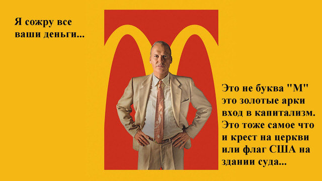 Идеология пропитана капиталистическим ядом, показано как один ничего не умеющий и не знающий человек может стать большим воротилой, при этом у человек нет детей и он развелся со своей женой, потом нашел себе другую женщину, потом и с другой развелся. Человек продвигает и продает семейные ценности, но сам даже не имеет своего потомства. Это как если бы Еврей продал бы Библию, в принципе в фильме это показано и прямо сказано что не важно во что ты варишь, в Христа или Сатану, главное это деньги. Желтая буква "М" это не буква, а золотые арки в капитализм, сродни Пентагону, Статуи Свободы или кресту на церкви. Это символ денег и могущества и каждый кро преломит хлеб в Макдональсе станет культистом новой капиталистической религии и отдаст часть своей души (часть своих денег) основателю этого культа.