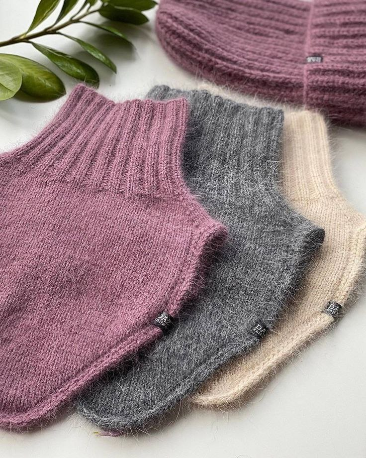На первой картинке мы видим несколько манишек разных цветов, с высоким горлом, и небольшим расширением по плечам, которое вяжется реглан-погоном. Манишка достаточно длинная, и хорошо подойдет для ношения под пальто. Горловина вяжется резинкой 2*2, далее полотно переходит на лицевую гладь, я по краю провязывается несколько рядов платочной вязки.