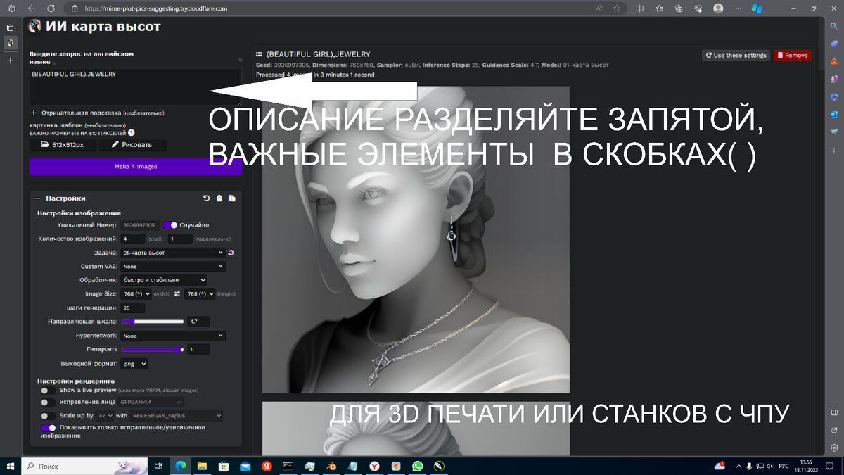 Несколько простых шагов: Придумайте вашу композицию и опишите её на английском языке. Важно разместить слова в запросе по мере значимости, например : JEWELRY, GIRL в этом случае возможно будет на заднем плане девушка , а акцент сделан на украшении или наоборот GIRL, JEWELRY ,в этом случае вы полчите изображение девушки в украшениях. На самом деле процесс создания запросов для ИИ очень занимателен и похож на ребус. Для описания на английском языке можно использовать онлайн переводчик Теперь немного о настройках ,они открываются при нажатии на "+" наиболее качественные результаты выдает модель, 01-карта высот. Проработники изображения - это по сути, дополнительные веса для ИИ, здесь всё подбирается путем проб, и в каждом конкретном случае результат будет отличатся. Это самый важный параметр, при изменении которого, результат будет сильно меняться , при значениях более 7, возможно подгорание изображения, и вместо оттенков серого ,вы получите цветное изображение с артефактами. Шаги в