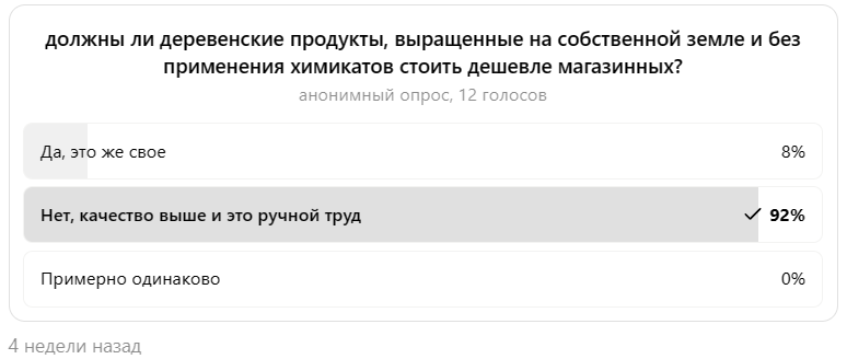 Месяц назад мы проведи небольшой опрос у нас в блоге, а должны ли эко-продукты стоить дешевле магазинных. И большинство тех, кто принял участие в опросе считают, что нет, так как качество выше.