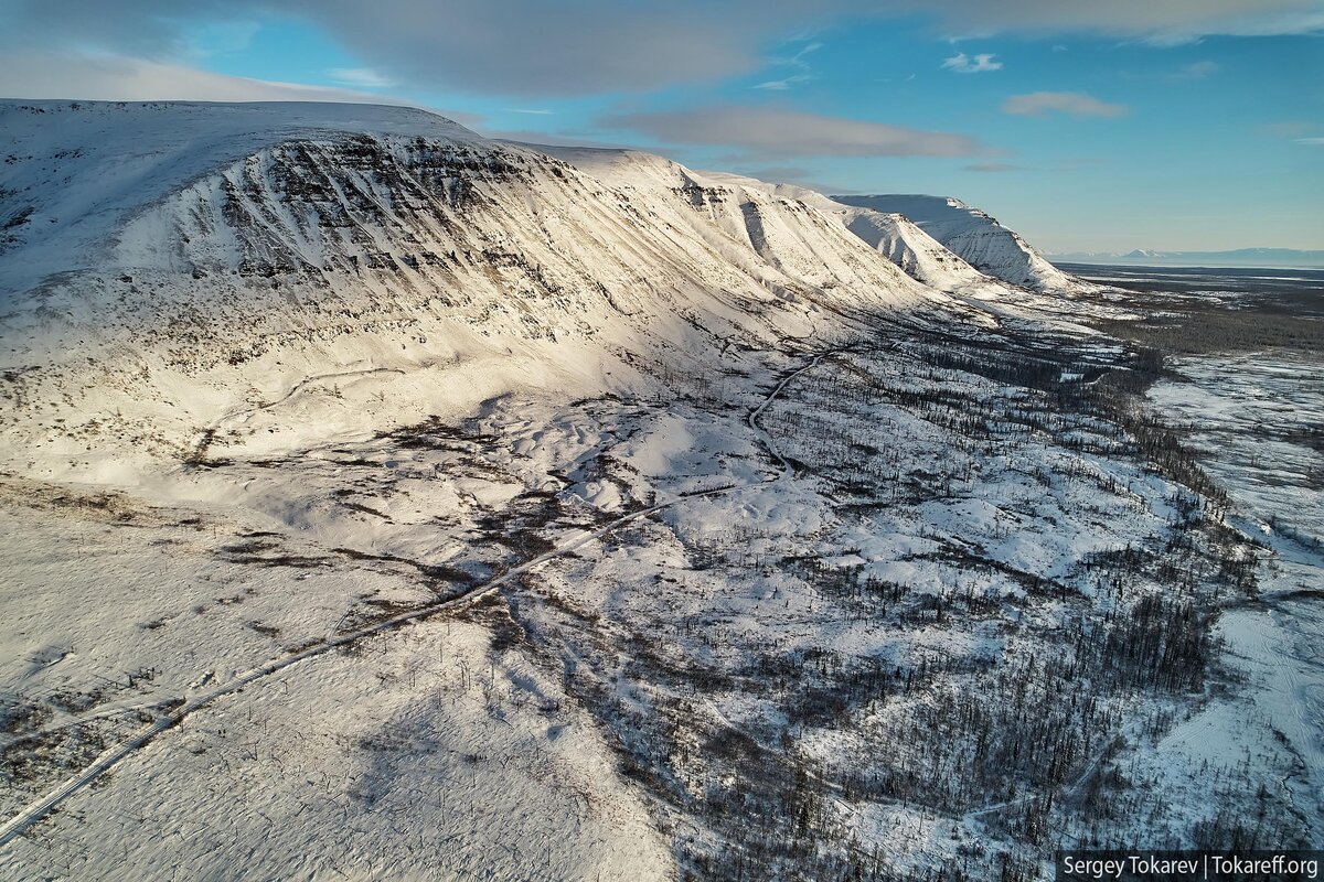 Рядом с Талнахом есть горный массив Хараелах. Это самое популярное природное место отдыха у норильчан. Когда летишь в Норильск, видишь с самолета тундру остается впечатление, что тут равнина, а между тем прямо рядом с городом горы с крутыми склонами по ~500 метров высотой. Этому хребту Норильск обязан своим существованием. Сверху горы, а снизу шахты на сотни километров, где добывают медь, палладий, никель, платину, кобальт и т.д. Это самые большие в России рудники. Весной спускался в шахту на "Скалистом" (одни, два) (самая глубокая в России) и "Октябрьском" (один, два). Так выглядит водопад. Сейчас, естественно, замерзший. Прогноз погоды в день похода был -23, ощущается как -27. В осенней одежде боялся замерзнуть, но в сухом климате холод воспринимается иначе. Пришлось даже вторую кофту снять, чтобы не спариться :) Через день прилетели в Красноярск и при -8 было очень зябко 😜 Повезло, что во время моего похода людей здесь не было. Супер ощущение, когда снег, горы, нет ветра и ты один