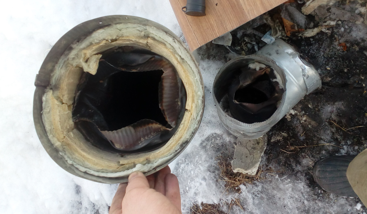 Здесь виновата марка стали. Если она не соответствует типу отопительного прибора, тогда дымоход толщиной хоть 2 мм - деформируется. На фото, сплав дымохода попросту не выдержал температуры горения.