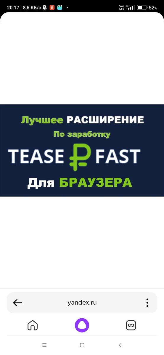 Здравствуйте дорогие читатели этой статьи. Сегодня у нас на обзоре проект под названием TeaseRfast на этом сайте можно заработать денег при помощи расширения в браузере ( это когда автоматически просматривается реклама) на этом конечно можно заработать но мало пойдёт для школьников ( я лично зарабатывал до 100 руб в день) да и счёт за электричество практически не покрывает. Можно заработать и выйти на доход до 300-600 руб это надо иметь много рефералов штук 150. Оцениваю 3 из 10.Проект выводит.