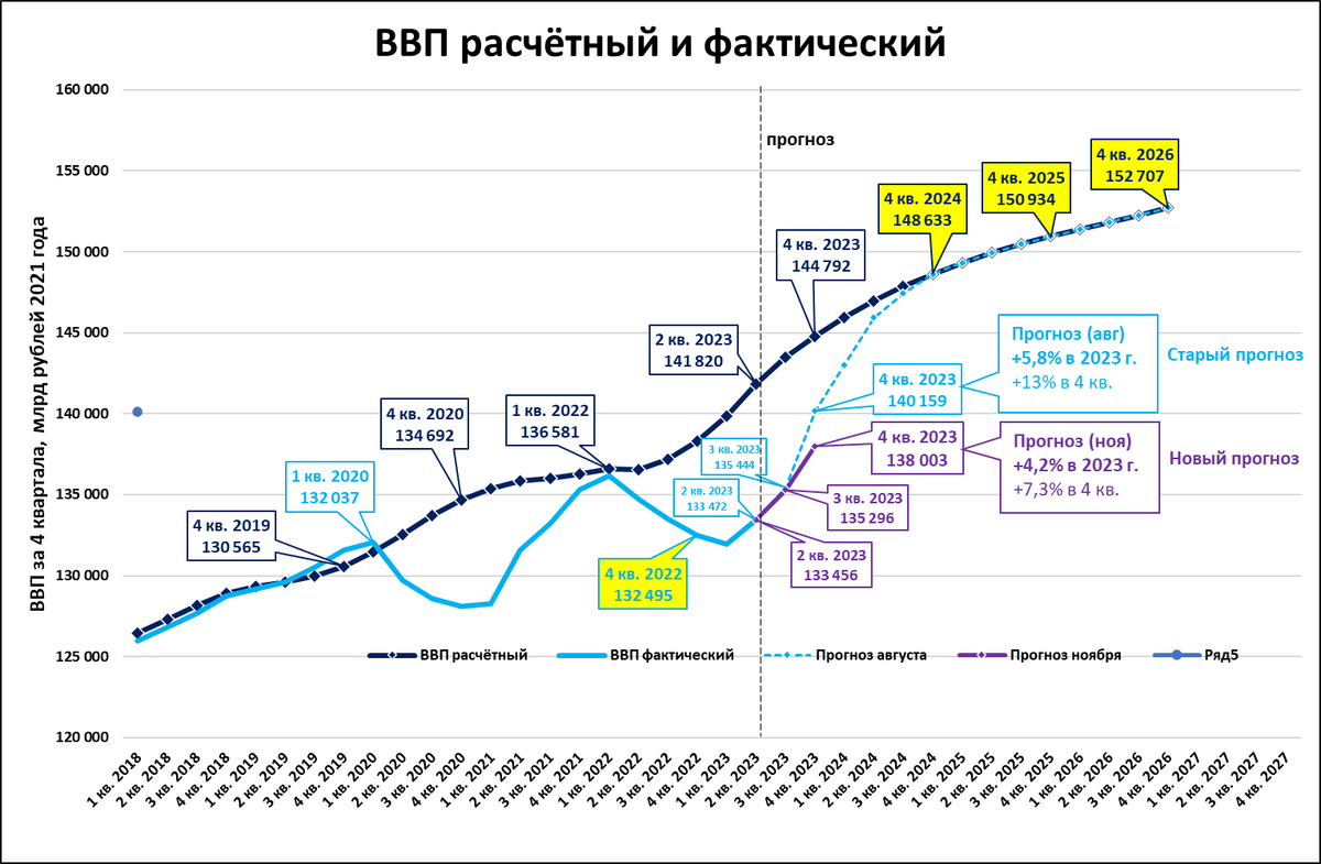 Учитывая фактическую динамику ВВП по данным за 3 квартала, мы понижаем свой прогноз роста ВВП в 2023 году с 5,8% до 4,2%. Прогноз роста в 2024 году повышается с 6,0% до 7,7%. В ноябре прогнозировать ВВП уходящего года почти не имеет смысла – год, практически, закончился. Тем не менее, учитывая новые данные по ВВП за 3 квартал, скорректируем наш ранее сделанный прогноз. На графике наглядно показан новый прогноз (фиолетовый цвет) и его отличия от предыдущего прогноза (голубой цвет). Фактическая траектория ВВП во 2 и 3 кварталах (фиолетовые выноски) идёт чуть ниже, чем ожидалось по нашему предыдущему прогнозу (голубые выноски). Исходя из этих фактических данных, для роста ВВП по итогам 2023 года на 5,8% необходим рост на 13% в 4 квартале. Даже таким оптимистам, как мы, такой рост кажется почти невероятным. Наш новый прогноз предполагает рост ВВП в 2023 году на 4,2% до 138 трлн рублей в ценах 2021 года. Причём его нельзя назвать пессимистичным: он предполагает ускорение роста ВВП в 4 квар