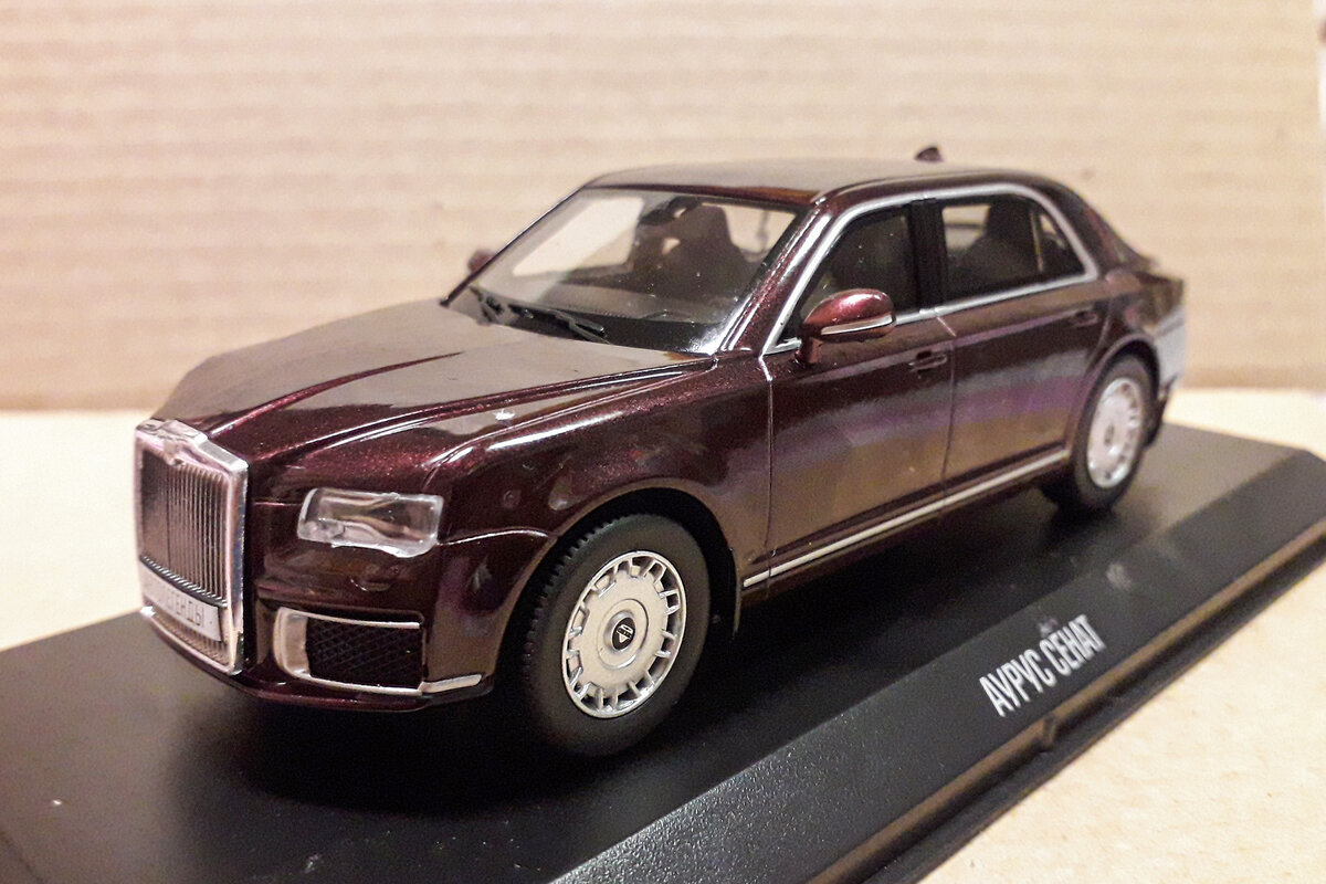 Модель автомобиля в масштабе 1 / 43 из личной коллекции. Производитель Deagostini. Российская марка автомобиля представительского и высшего класса разработанного в рамках проекта "Кортеж". Разработка проекта ведётся институтом «НАМИ» с 2013 года как платформа для создания транспорта для «перевозки и сопровождения первых лиц государства, а также других лиц, подлежащих государственной охране». Первыми представленными широкой публике машинами стали использованные 7 мая 2018 года на инаугурации президента России автомобили : седан Aurus-4123 и лимузин Aurus-41231SB. Название «AURUS» образовано от слияния двух слов : Aurum — «золото» и Russia — «Россия». Главный конструктор проекта — Вадим Переверзев, который до этого 15 лет работал в «Fiat», а ранее — в «ГАЗ». Юрий Черненко — главный дизайнер проекта «Aurus» По словам Юрия Черненко, начальника управления дизайна ФГУП «НАМИ», в качестве стартовой идеи при разработке стиля «Aurus» был взят дизайн ЗИС - 110, первого советского послев