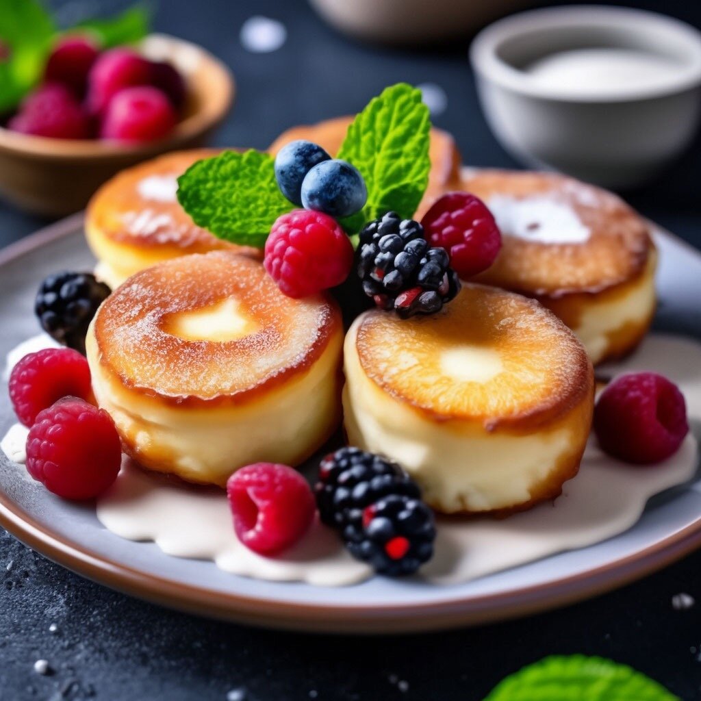 Сырники обжаренные с хрустящей корочкой, политые сгущенкой украшены ягодами и мятой, профессиональное фото, красиво, реалистично, 4к, высокое разрешение, высокая детализация, крупным планом мягкое освещение