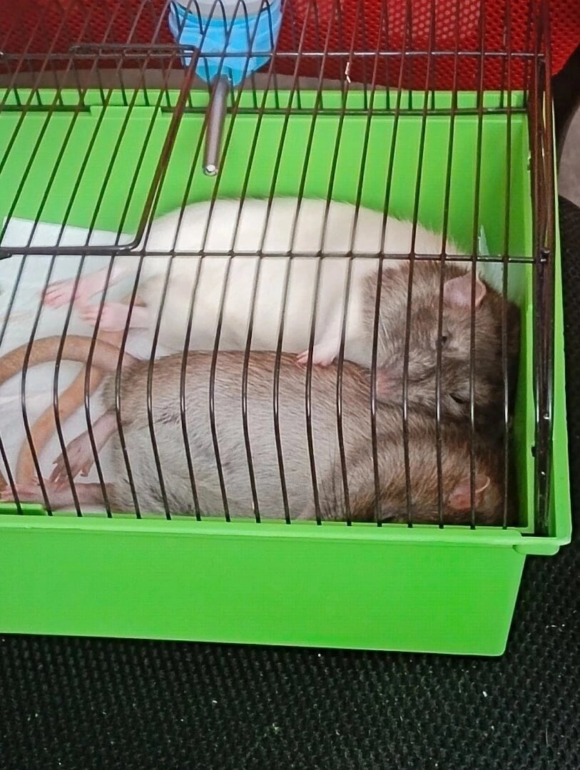 Жил-был полупасюк Дон. И крысомама человекоподобная его очень-очень любила. Одна беда - брат Дона рано отправился на радугу, и не было у него крысодрузей. Крысомама решила, что это неправильно. И был привезен для Дона друг издалека. Но знакомство не заладилось - испугался новый знакомый незнамо чего, и начал кусаться - да так, что искромсал руку крысопапе, кинувшемуся на защиту Дона. И пришлось крысомаме везти нового знакомого к дяде доктору, и отрезал дядя доктор ему кое-что лишнее, что мешало быть добрым и миролюбивым. И вот после этого знакомство прошло как по маслу... Живут теперь вместе два кабачка, спят в обнимку - и это как раз есть настоящее крысье счастье, ибо крыса - существо социальное, и одиночное содержание оных в некоторых странах приравнивается к жестокому обращению с животными. (Дон - агути, полупасюк, год и месяц; Мякиш - капюшон декоративный, кастрированный, 9 месяцев). Прим. : клетка использовалась исключительно для сселения телепузиков. Крысики Анны С. #окрысах