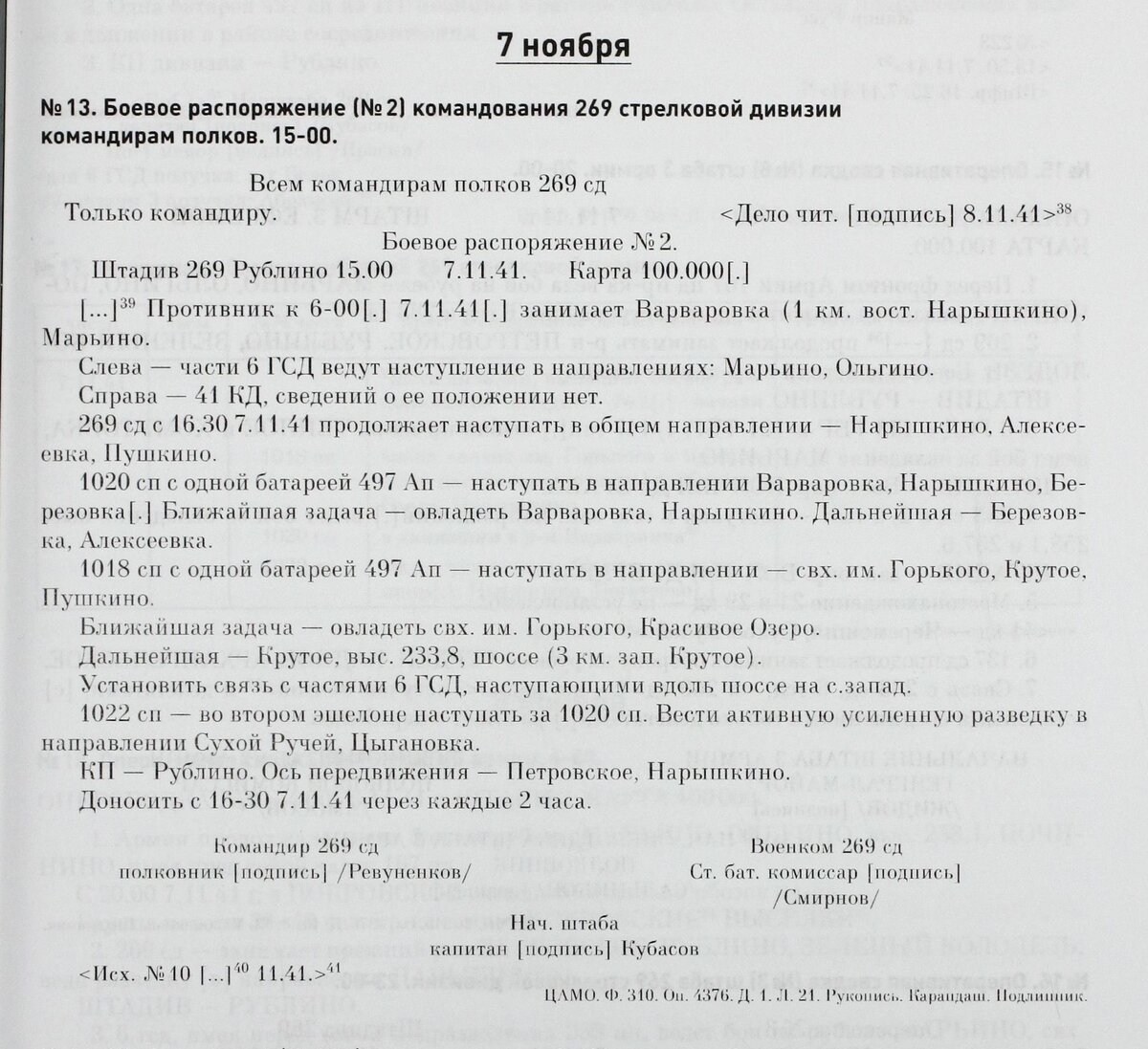 Просматривая боевые донесения за осень 1941 года, наткнулся на документы 269 стрелковой дивизии. Обратил внимание на звание начальника штаба дивизии – капитан. Конечно, в 1941 году всякое могло быть, но для очистки совести решить попробовать пробить сайт 269 сд. И, как оказалось, совсем не зря. Кубасов Алексей Федорович начинал службу в этой воинской части начальником 1 отделения штаба, а покидал ее командиром дивизии. Войну начинал в звании капитана, в октябре 1942 года получил звание полковника, а в декабре 1943 года в наградных документах значится генерал-майором.