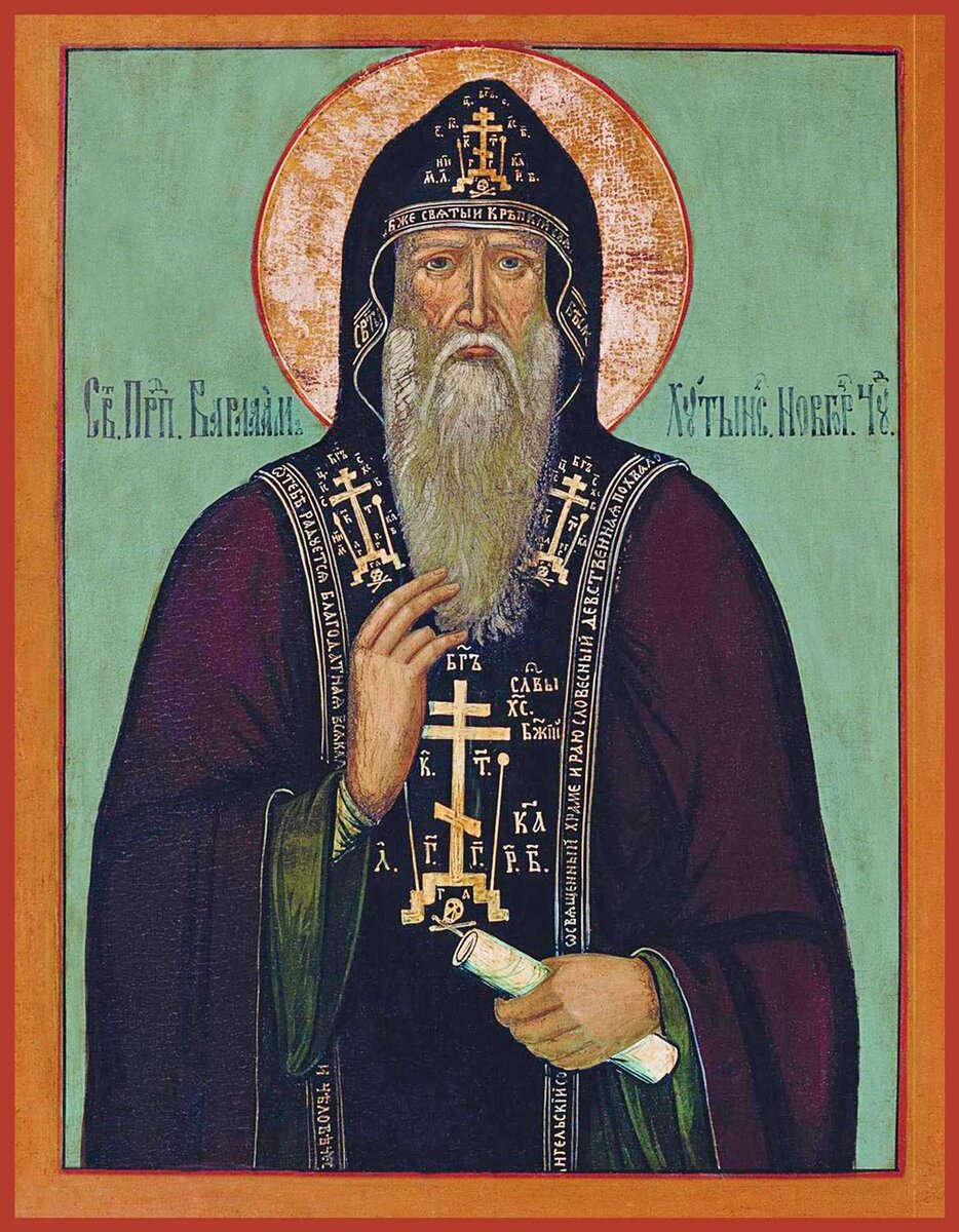 Преподобный Варлаам, в миру Алексей, был сыном именитых и благочестивых граждан великого Новгорода, Михаила и Анны. После смерти родителей Преподобный раздал все имущество бедным, принял постриг с именем Варлаама и в поисках полного уединения отправился за Новгород, в местечко Хутынь (худынь, худое место). Подходя к Хутыни, Преподобный увидел светлый луч, просиявший из густой чащи леса. Из этого знамения он понял, что его намерение поселиться здесь согласно с волей Божией. Весь день он проводил в трудах, а ночь – в молитве, строго постился, носил суровую одежду и вериги. Вскоре к святому Варлааму стали стекаться князья, бояре, простые люди за советом и благословением; многие просили позволения поселиться вместе с ним. Преподобный с любовью принимал всех, кто к нему обращался. За свою добродетельную жизнь Варлаам еще при жизни был прославлен от Господа даром прозорливости и чудотворения. Однажды, святой, проезжая мимо казни, остановил палача, спасенный принял иночество и, пожив некото