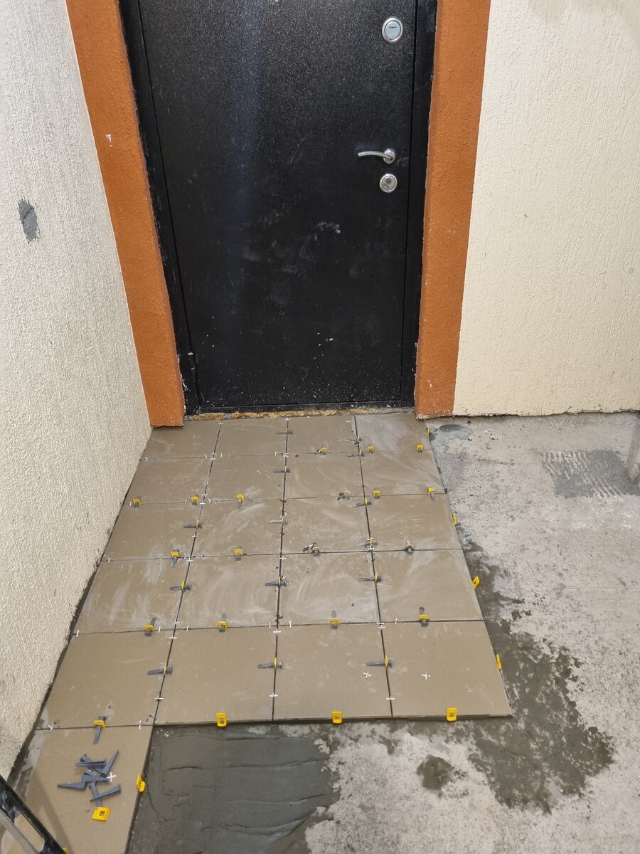 Уже практически доделываю входную группу, летом заливал черновой пол по маякам и наконец пришло время укладки плитки. В момент заливки чернового пола были плохо выставлены маяки из маяков для стен. В следующий раз не буду использовать ... Но сейчас не об этом. Из-за плохо выставленных маяков пол получился с перепадом в 2 - 3,5 см . подумай, что выровняю наливным. Итак, настало время укладки плитки. Решил выравнивать по ходу укладки плитки. Это было ошибкой. Швы постоянно приходилось чистить, выдавливает плиточный клей, грязь. Итоги первого вечера укладки По итогам первого вечера понял , что СВП нужно ставить туда где вставлены крестики. Но устанавливать много СВП не хотелось и как то думал схитрить, профессиональные плиточники бы "заругали" меня, но так как строю сам , то всё приходит с опытом. Доделал до конца , помещение составляет 3,3 * 2,5 метра поэтому справился за неделю, работая по 2-3 часа вечером после работы. Затирка далась легко, проблем не было, главное почистить пер